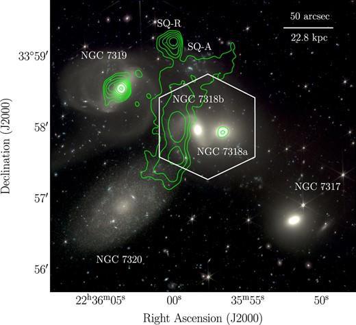 Виновник происшествия галактика NGC 7318b, которая на скорости 3,2 млн км/ч впилилась сразу в четыре соседние галактики.