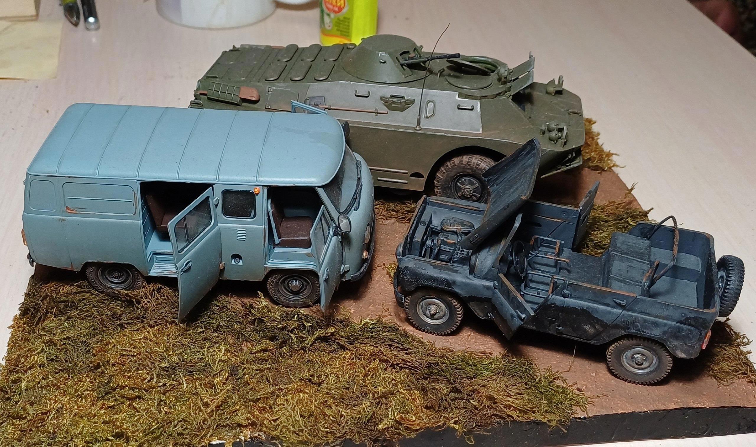 3. Диорама по "Змеиной осени" не то чтобы готова, но уже обрела основание. Техника пока расставлена "на глазок" - надо добавить заборы, кусты и подумать, хватит ли перед "буханкой" места для сцены допроса колдунов, ну и подобрать фигурки :)