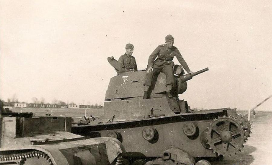 Оставленные в парке 67-го тп в Гродеке-Ягеллонском Т-26 обр.38г и танкеткa Т-27. У танка повреждён тормоз отката орудия и накатник.