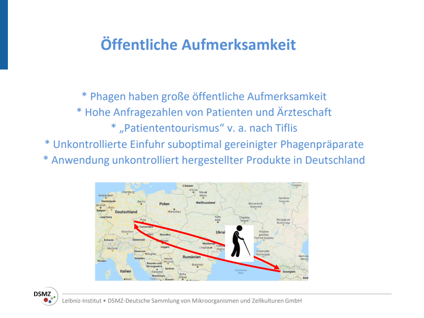 В презентации института Лейбница об истории фаготерапии упоминается, что из Германии был настоящий “пациентский туризм” (цитата) в Тбилиси, где находилась хирургическая клиника профессора Цулукидзе, который часто упоминается в наших документах. Также говорится, что наличные фагопрепараты применялись абсолютно бесконтрольно. На сайте немецкого фагоцентра упоминается, что после 1941-ого фаготерапия в Германии перестала применяться.