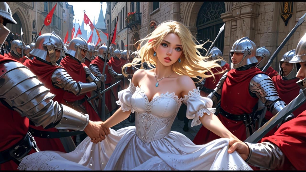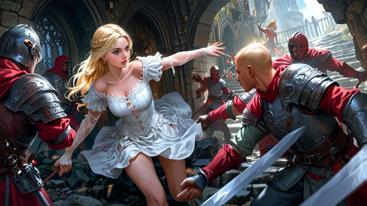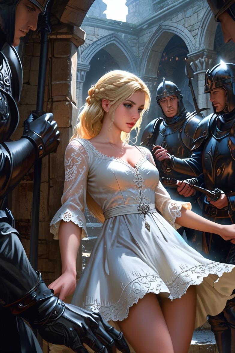 Принцессу под угрозами затаскивают в замок Черной гвардии.