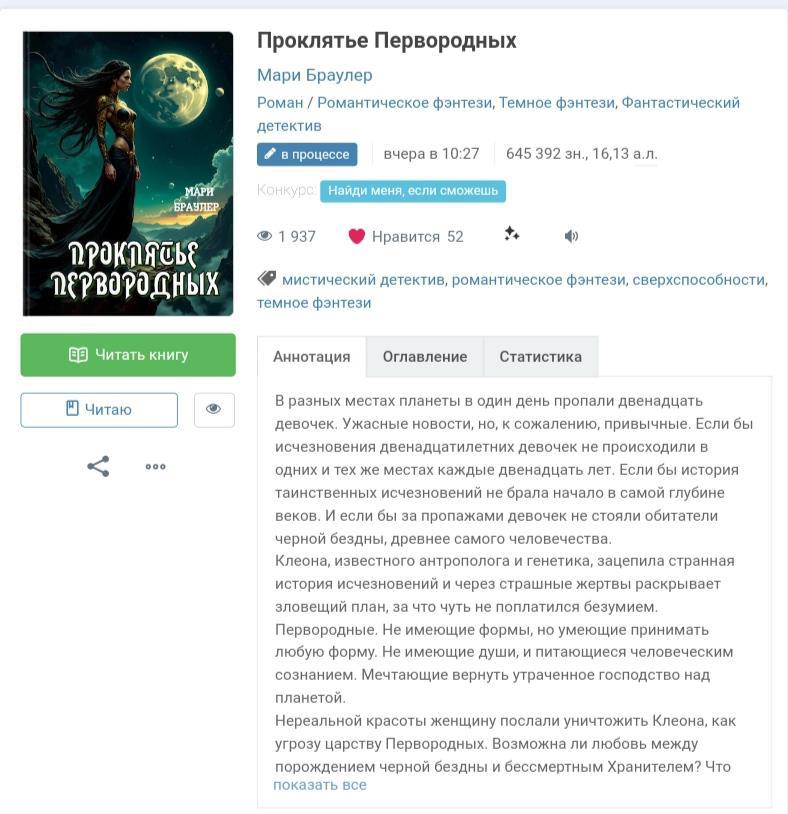Познакомились мы с ней всё в том же чате. Мари человек спокойный, многословный, как в книгах так и в жизни. Как говорит она сама - страдающий словесной диареей)))) и книги её получаются большими, подробными. Мне этот формат нравится. Читая, точнее слушая её книгу Проклятье Первородных словно смотрю фильм.