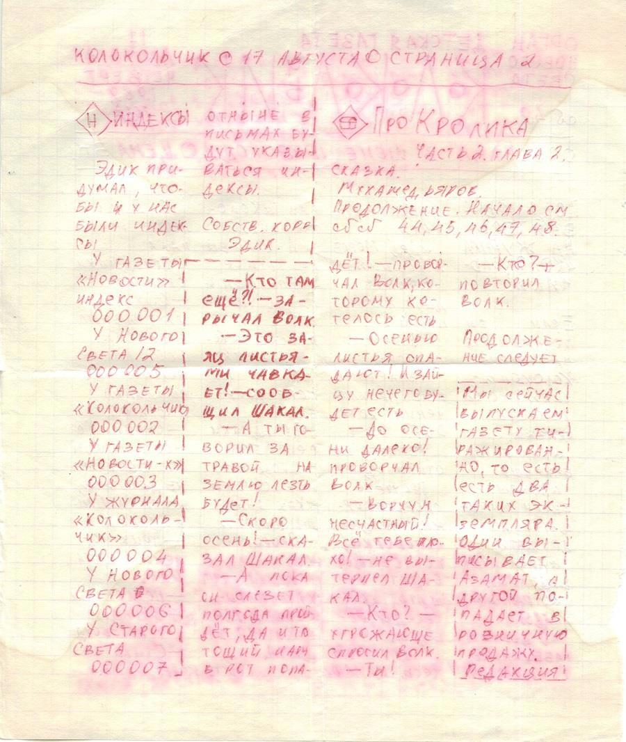 В свой газете "Колокольчик", №49, 17 августа 1989 года, я как раз написал о внедрении индексов. Самая первая газета "Новости" получила индекс 000001, газета "Колокольчик" - 000002 и так далее.