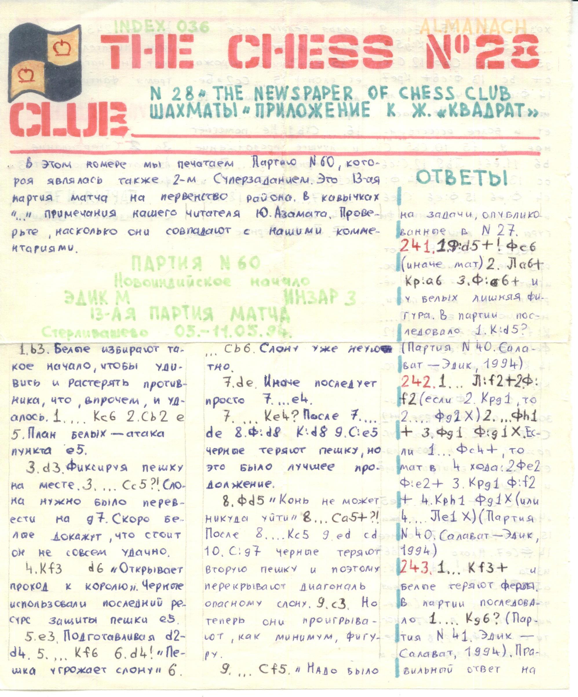 Я выпускал ещё газету "Шахматы" (1993-1994), в которой размещались шахматные партии сыгранные нами самими с моим анализом, вернее, попыткой анализа.
