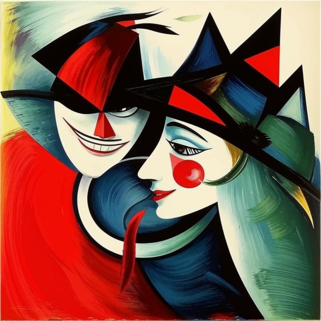 Одной рукою на двоих обняться молча - и безотрывно - в глаза волчьи... Миленькие цветные кирпичики по сторонам - узнаем Кандинского.