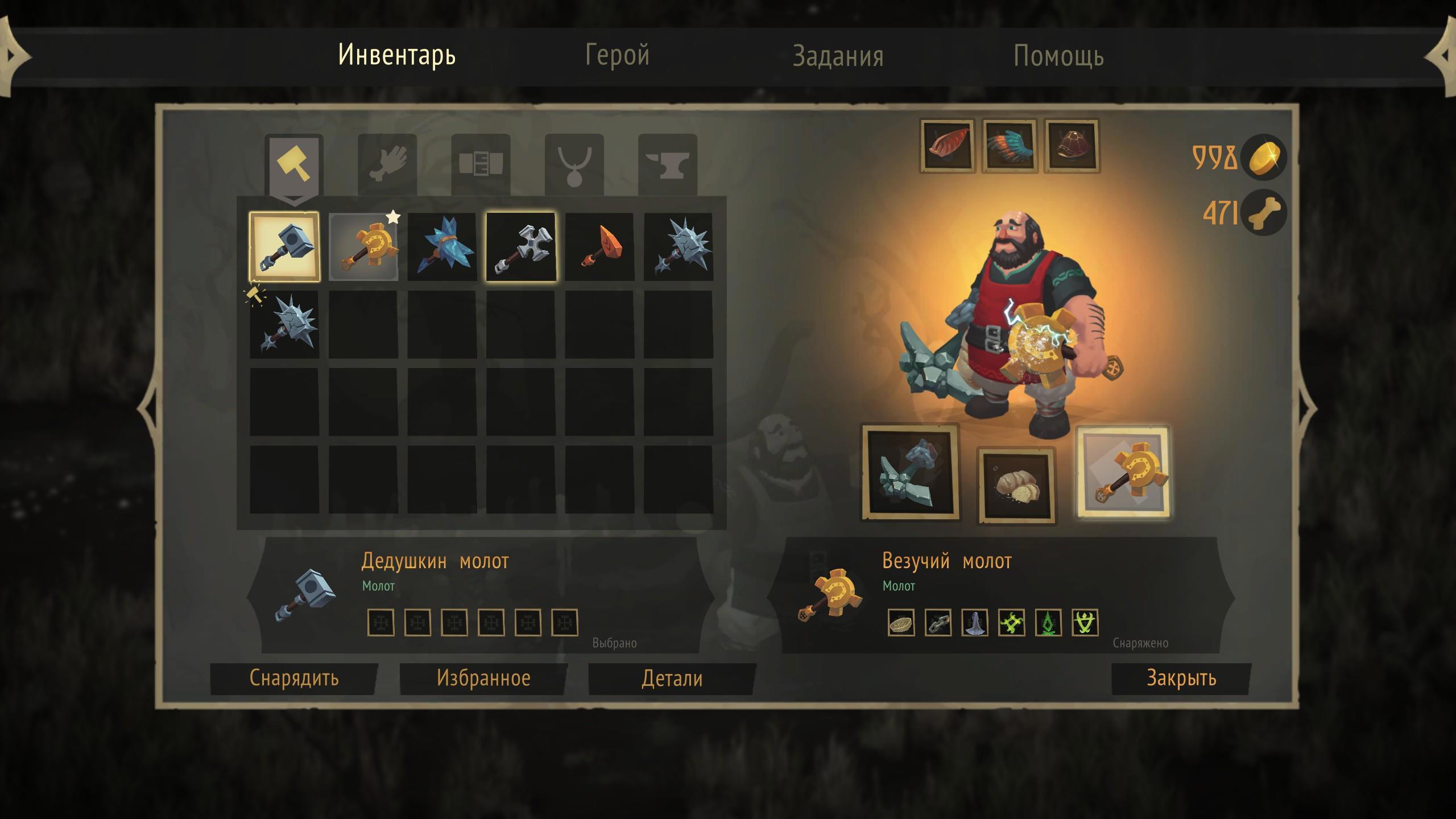 Между боями Иван может ковать себе новое оружие, чинить уже имеющееся, а также улучшать наковальню, позволяя делать всё более и более мощные молоты.