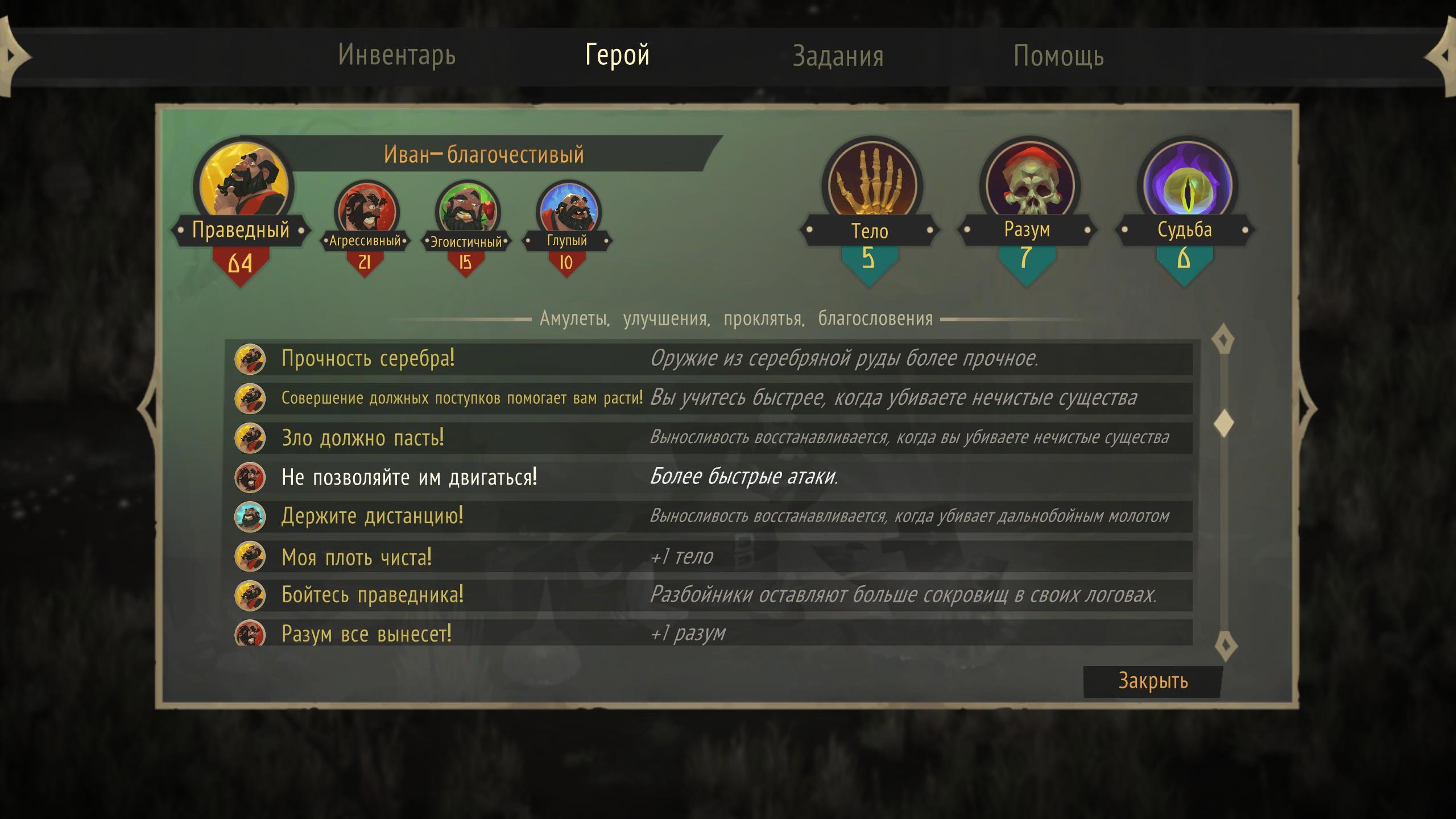 Характеристик у Ивана три: Здоровье, Выносливость и Судьба. Последняя определяет, как скоро заполнится полоса невезения, дарующая большей приход опыта, но гарантирующая сюрприз от Лиха.