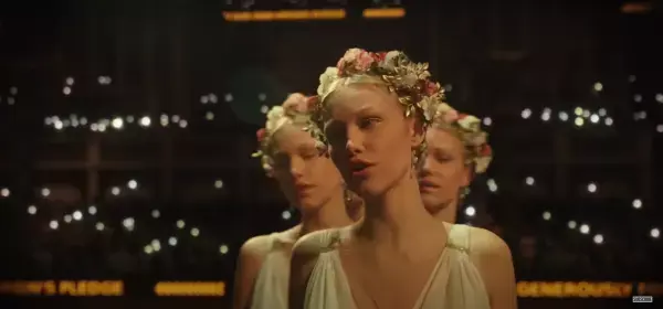 Лучшее, что есть во всём фильме, ИМХО. Звезда поп-музыки Веста продаёт образ невинной храмовой девы. Она приходит в этот вертеп, в Колизей, перед очи всей элиты. Она улыбается задорно и доверчиво. Такая милая, с покрытой головой, её подтанцовка из весталочек тоже вся юная и в платочках. Формально Весте 16, на самом деле — 23, её ещё ребёнком вывезли из Индонезии (кто понял, тот понял — непохоже, чтобы у неё были шансы что-то сохранить).