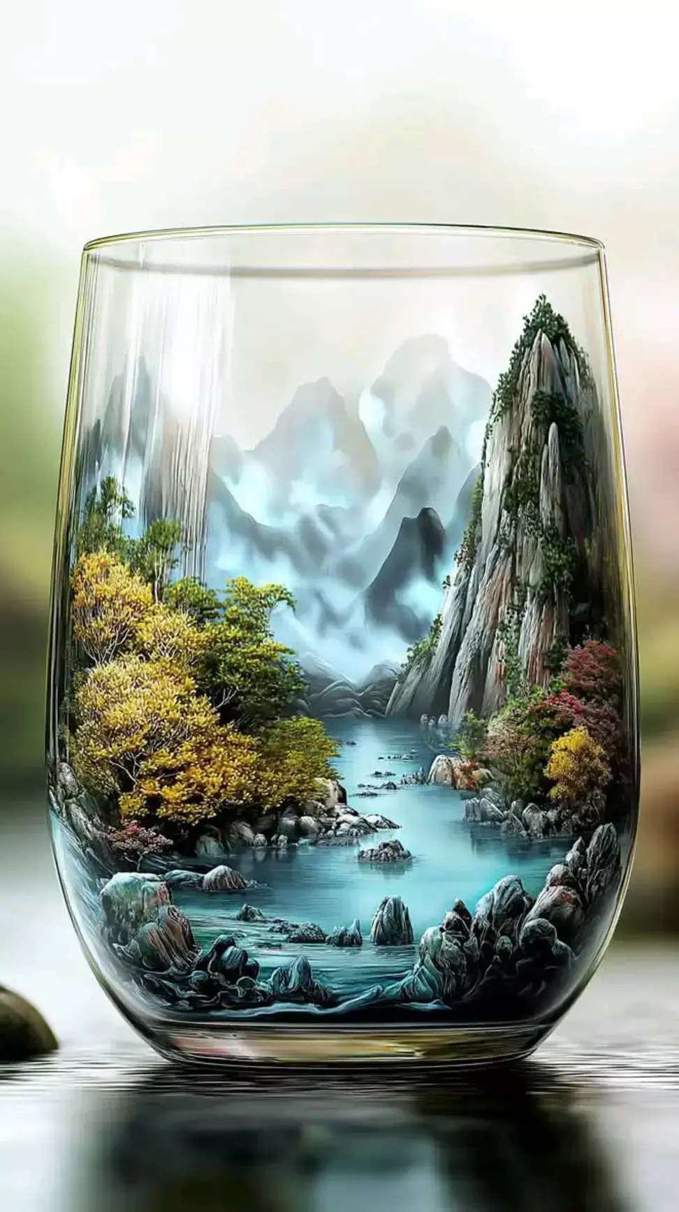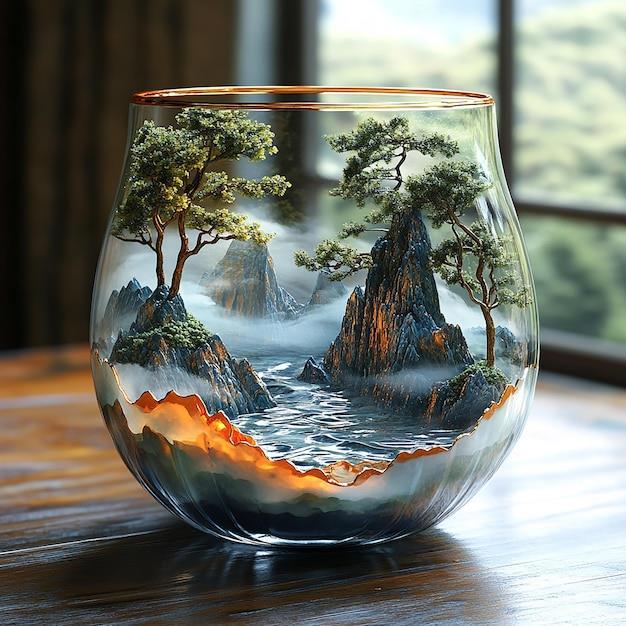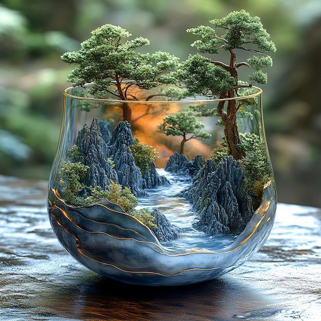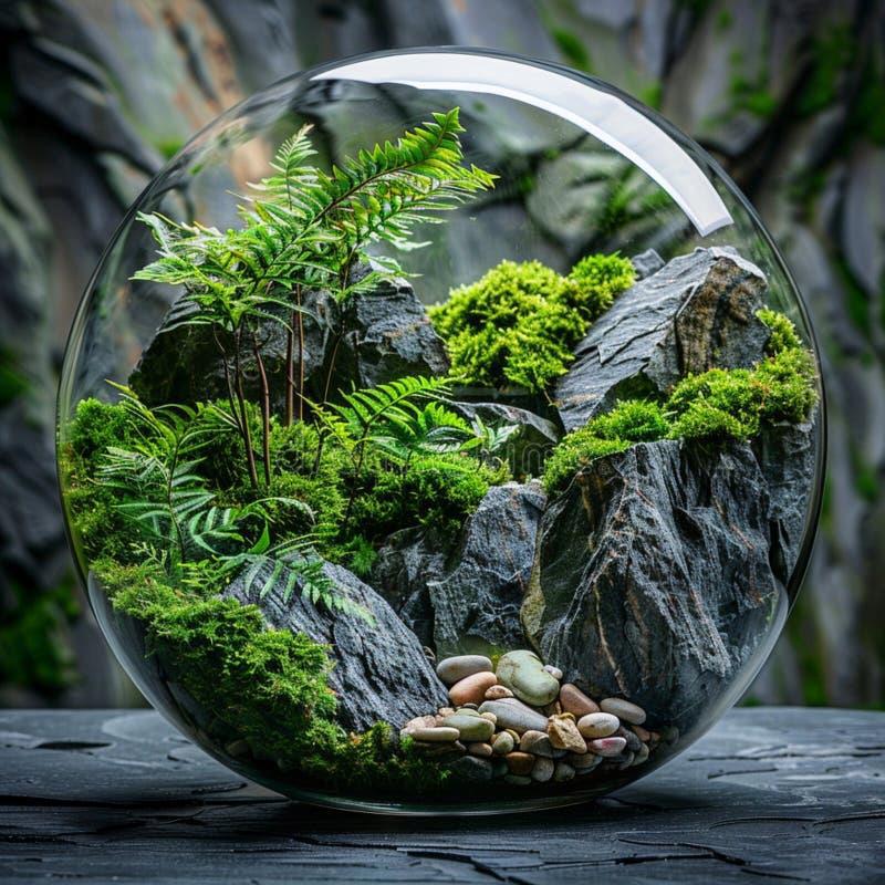 Иллюстрация, созданная искусственным интеллектом, зеленый мох, стекло, камни в террариуме