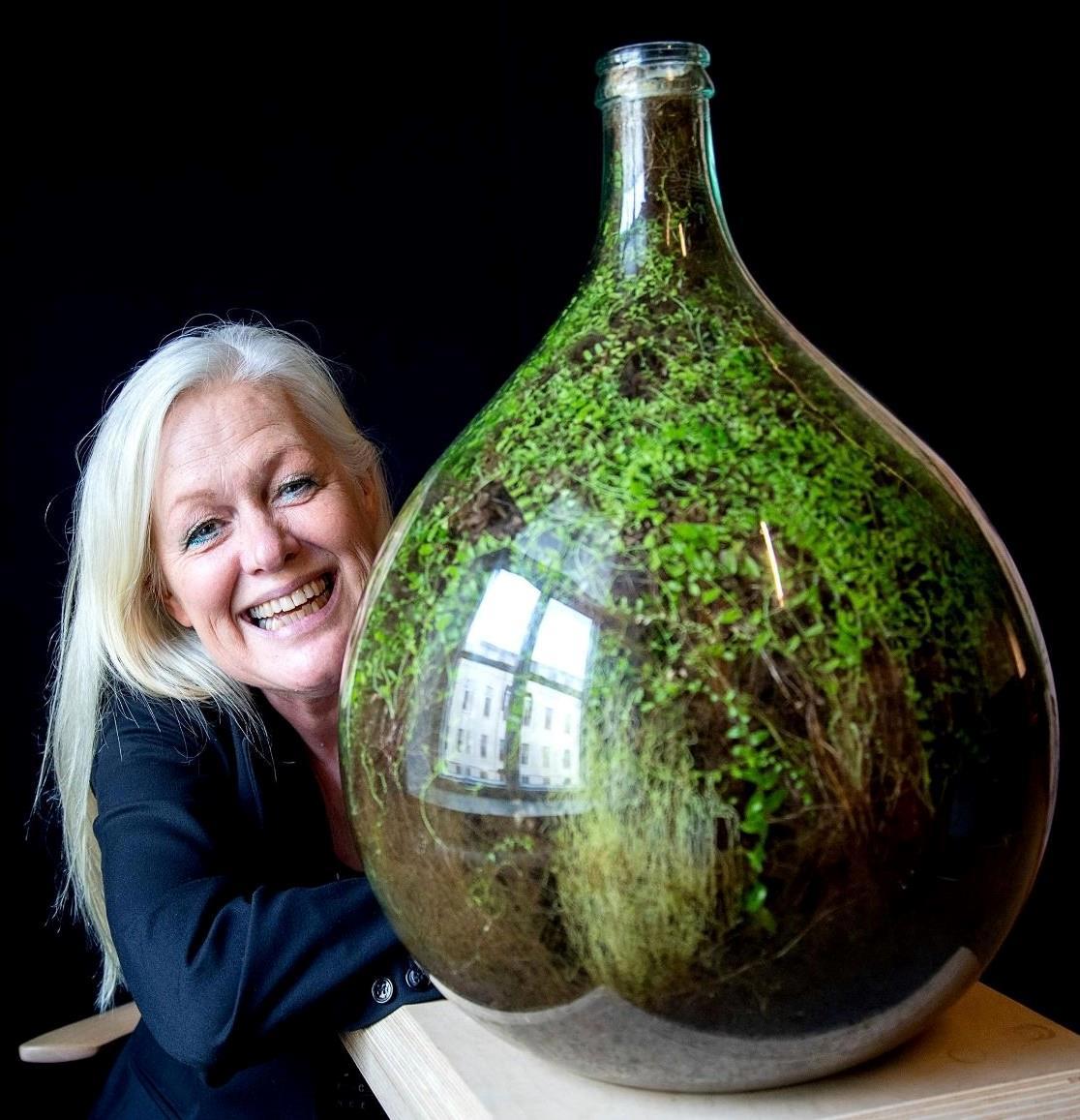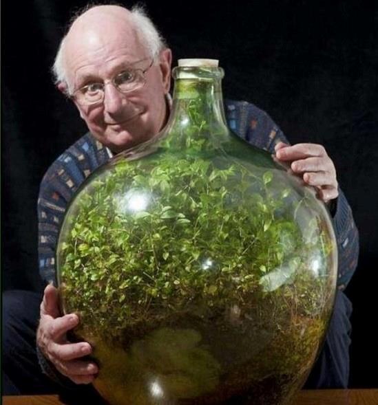 Растение, которое он 40 лет назад посадил в бутылку, закупорил и ни разу не открывал. В бутылке образовалась экосистема, в которой растение само ухаживает за собой, производит кислород и питается перегноем.