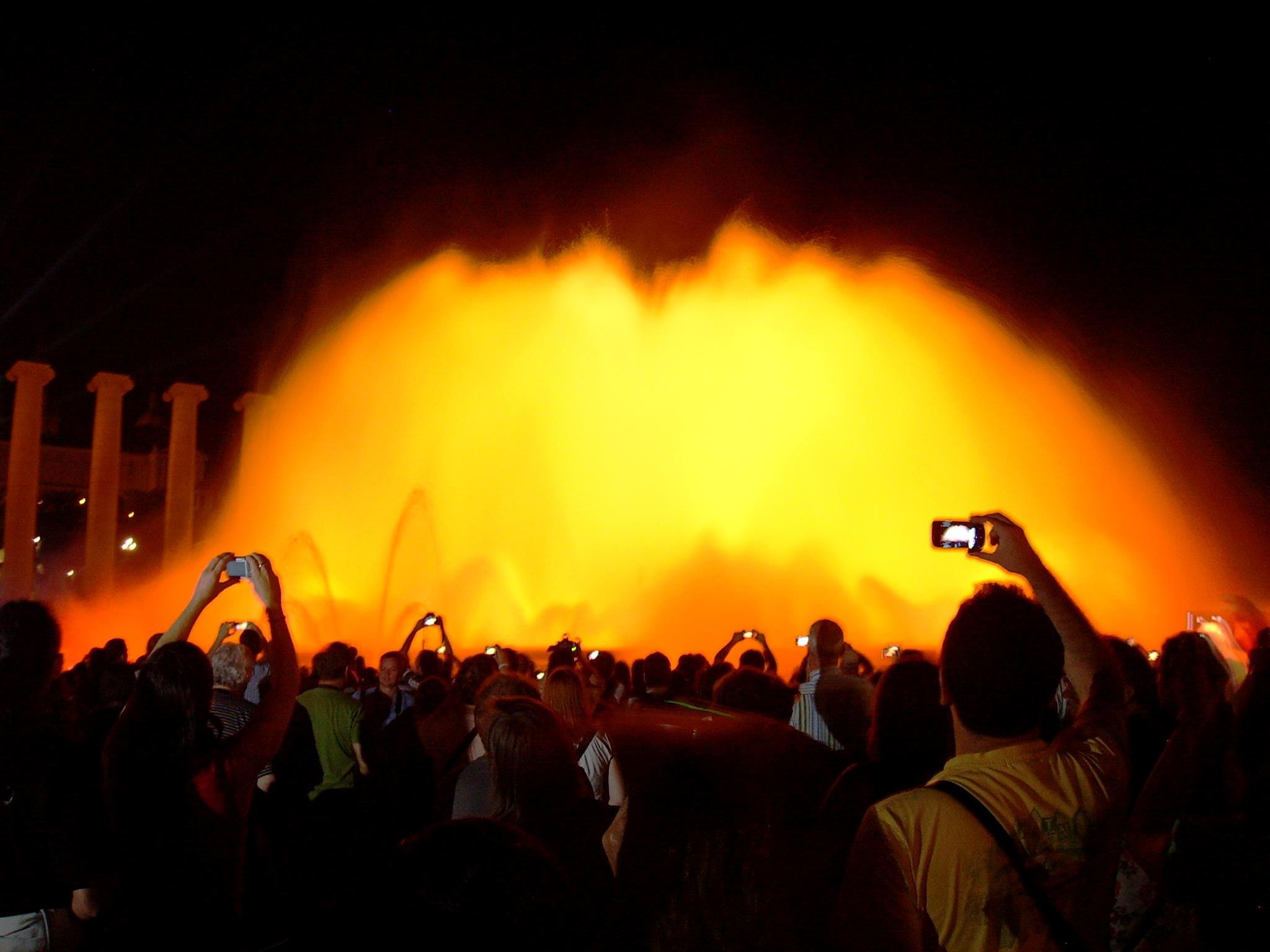 Сели, едем… Один круг… второй начался… все те же остановки – солнце вечернее светит. Автовокзал в очередной раз проехали, музеи на горе Монтжуик, набережную… Опять автостанция, музеи на горе Монтжуик, набережная… опять… Оп! А ведь пора уже и к фонтанам! А еще и не ужинали, не начинали даже. Сели на проспекте Параллель (так и называется), невдалеке от пл.Испании, где фонтаны. Заказали мяса, пива… Пока все съели – стемнело уже. Но, на фонтаны не опоздали, нет – тут рядом. Стоим, любуемся. Вода красивыми струями плещет. Подсветка. Фредди Меркури… Вдруг вспомнил – электричка-то! У-у-у-у-! ночуй потом под лавкой.