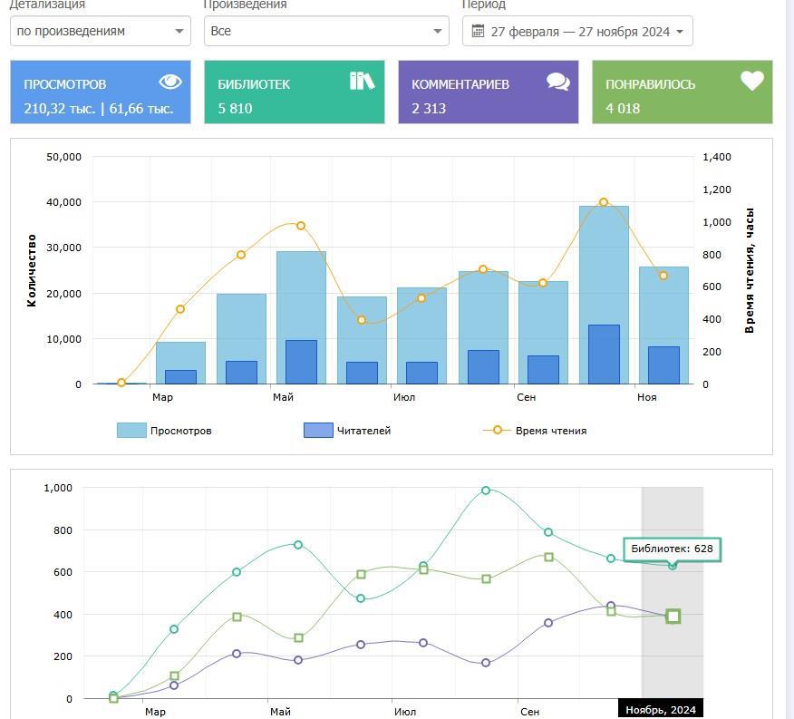 Ноябрь был самым непродуктивным по выработке месяцем. Опубликована половина романа и он завершён, один цикловый рассказ и несколько крохотных глав повести. Вот и всё, за целый месяц! Нужно брать себя в руки. Учитывая всё это, очень радостно, что глобально показатели не обрушились. За это хочется сказать огромнейшее спасибо всем тем, кто читает и находит меня, несмотря на редкие обновления! Спасибо вам, что помогаете не потерять достигнутого тяжёлым трудом в период сложностей в реале! Ваш отклик помогает мне верить в себя и свои силы!