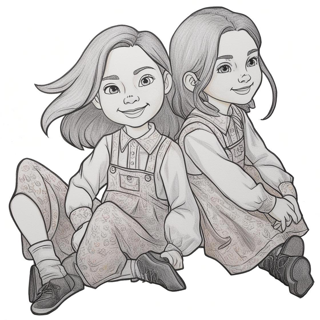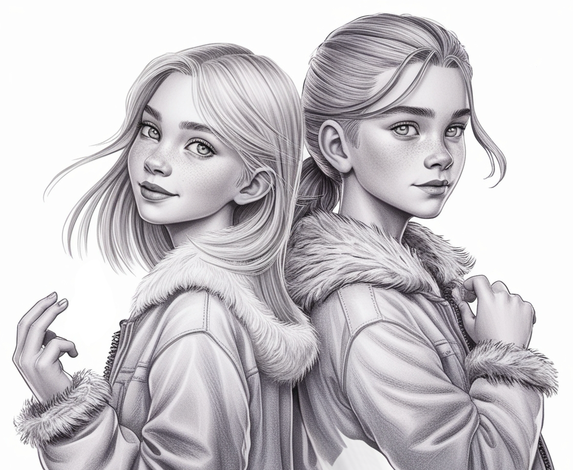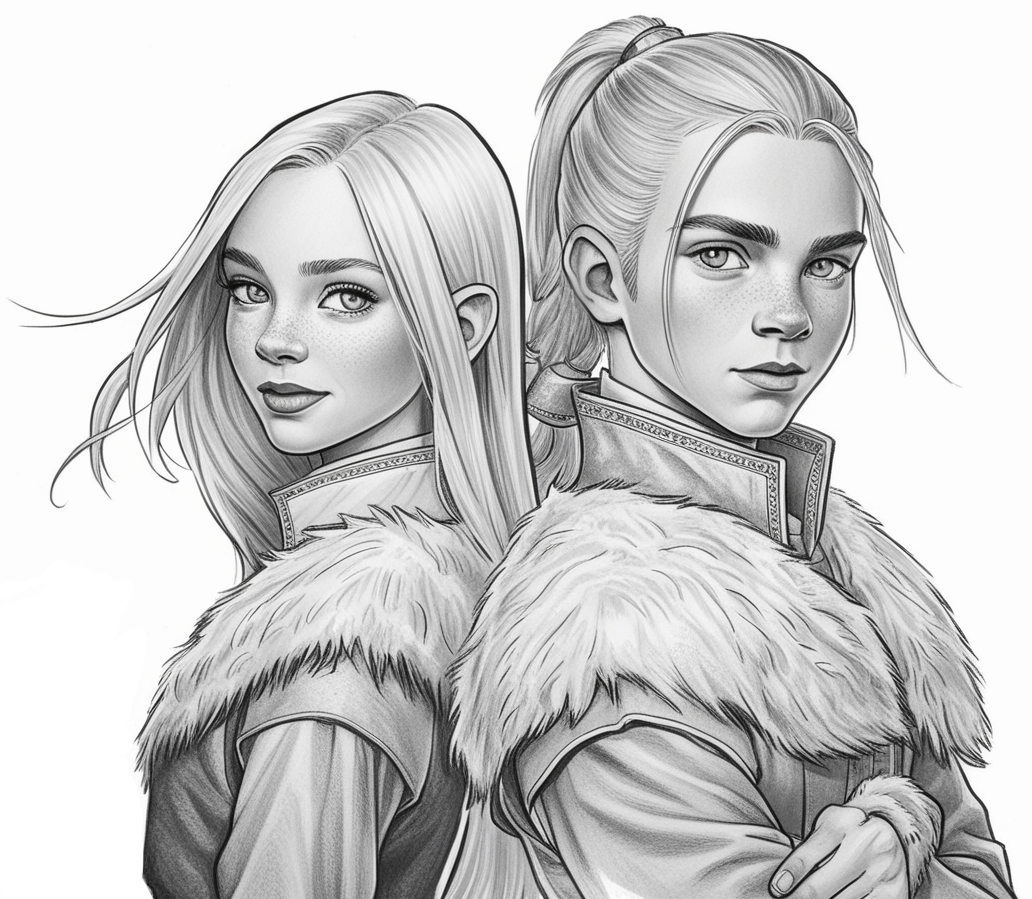 В качестве основы я использовала иллюстрацию, исполненную для меня профессиональной художницей. Я попросила нейросеть пофантазировать, как бы мои герои выглядили в первой части книги, в детстве и юности, и вот что получилось: