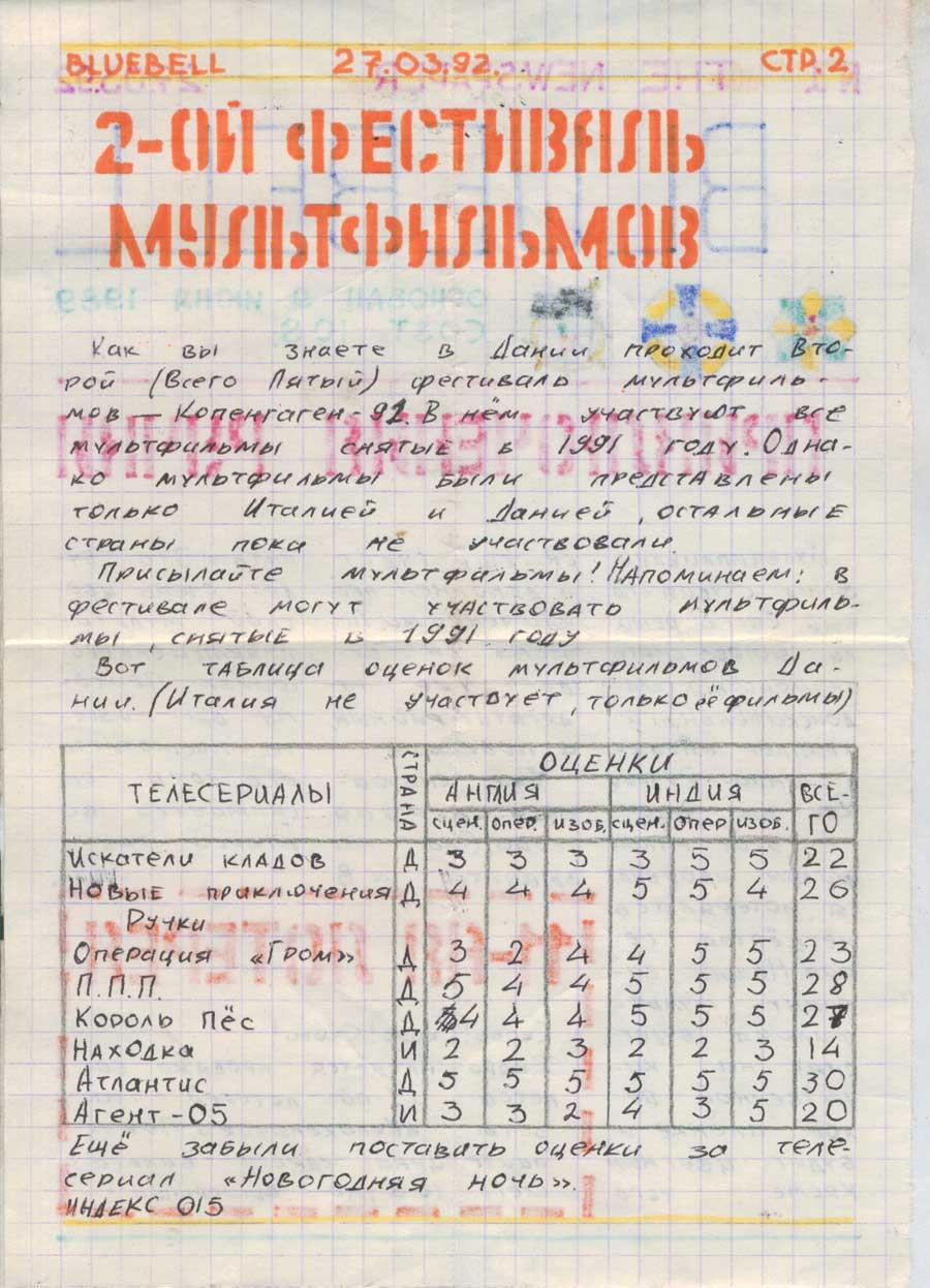 В газете "Колокольчик", №74, 27 марта 1992 года, есть таблица с оценками как раз в номинации "Мультсериал". По оценкам видно, что первое место занял мультфильм "Атлантис", снятый в жанре детективной космической фантастики.