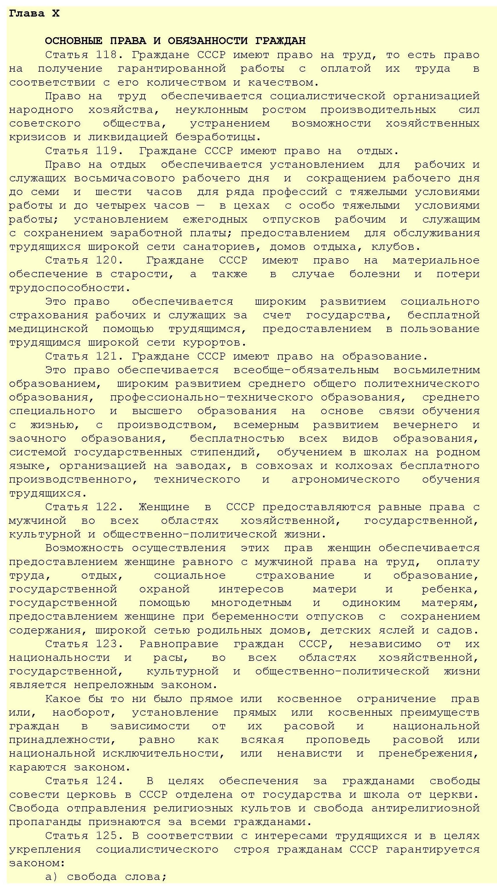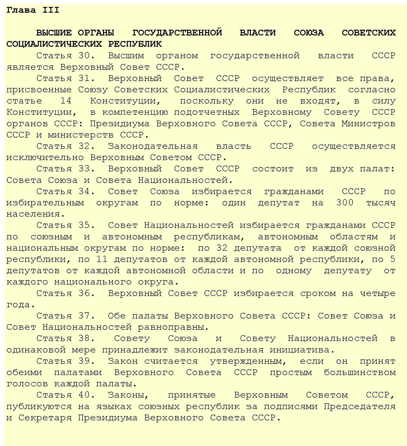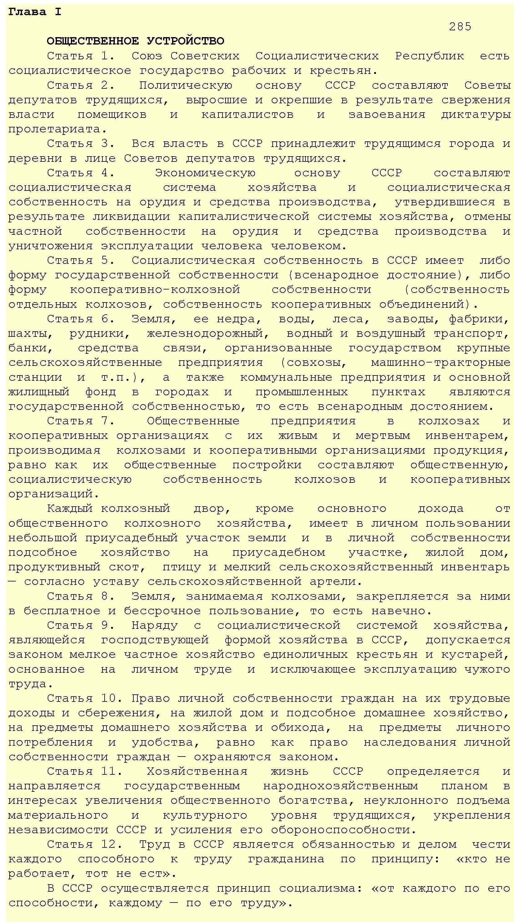 Конституция провозглашала СССР социалистическим государством и определяла его основы. Подтверждалась добровольность союза республик, полное равноправие народов и их право на самоопределение. Основой организации и деятельности государственных органов утверждался демократический централизм. Определялась структура общесоюзных органов власти. Впервые в Конституции законодательно закреплялось руководящее положение ВКП(б) в политической системе страны. В Конституции сохранялся лозунг «Кто не работает, тот не ест»; труд объявлялся обязанностью и делом чести каждого трудоспособного гражданина и законодательно закреплялся принцип социализма: «От каждого по способностям, каждому – по его труду».