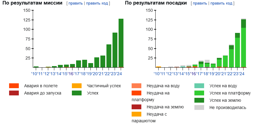 Как видно из графика, ракет сейчас запускают больше чем в разгар «Лунной Гонки». Половина запусков традиционно пришлась на одну ракету, по странному совпадению единственную пока что многоразовую. Или одну из двух если Фалькон-Хэви считать отдельно: