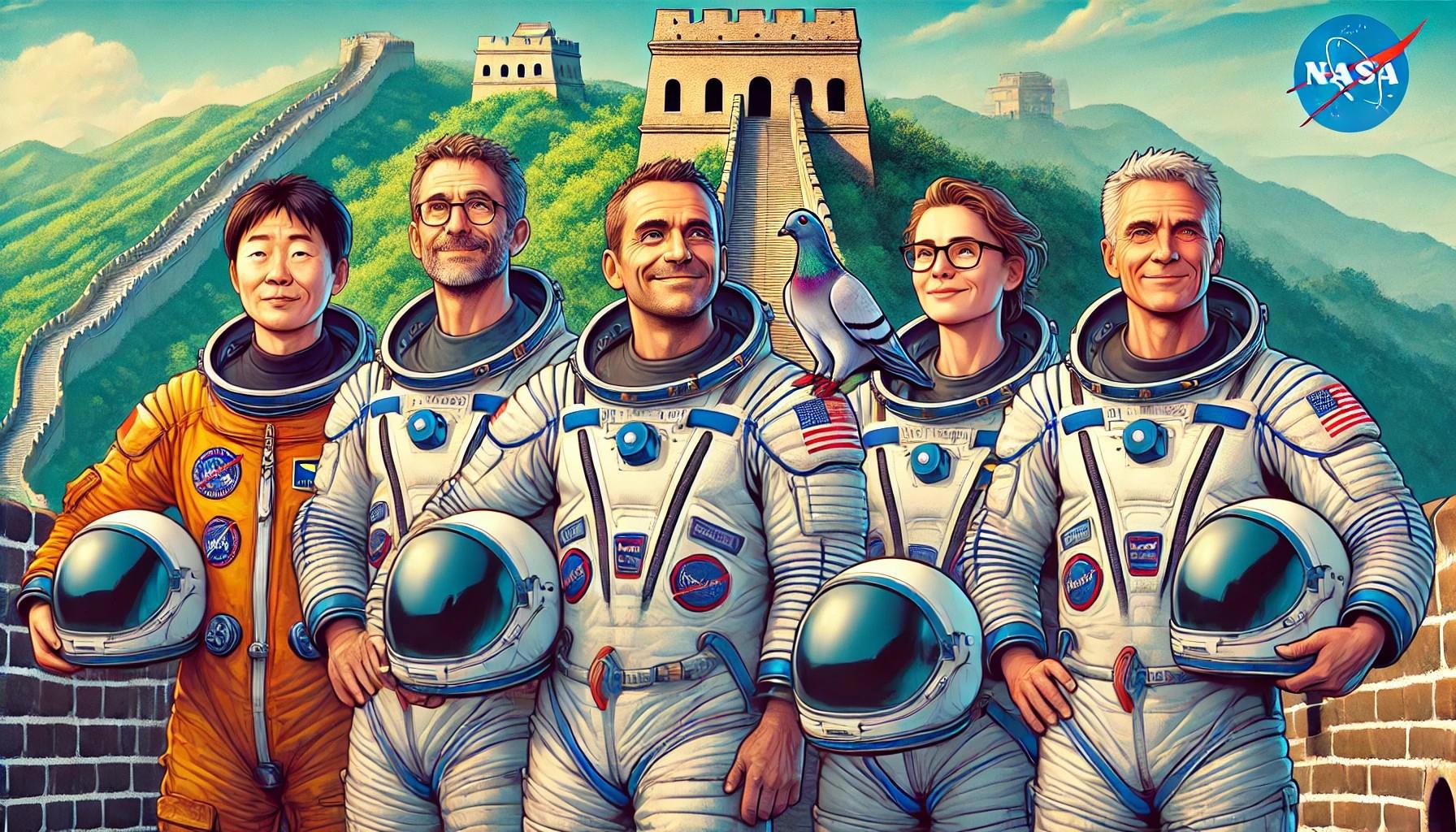 Автор: Дэн ШоринВнизу картинка, нарисованная чатом гпт сегодня. Ещё ниже, кусок текста из повести "в работе", написанный года полтора назад и в сети не светившийся. Если что - этот текст чат гпт не видел, он просто нарисовал пятерых астронавтов на фоне китайской стены.