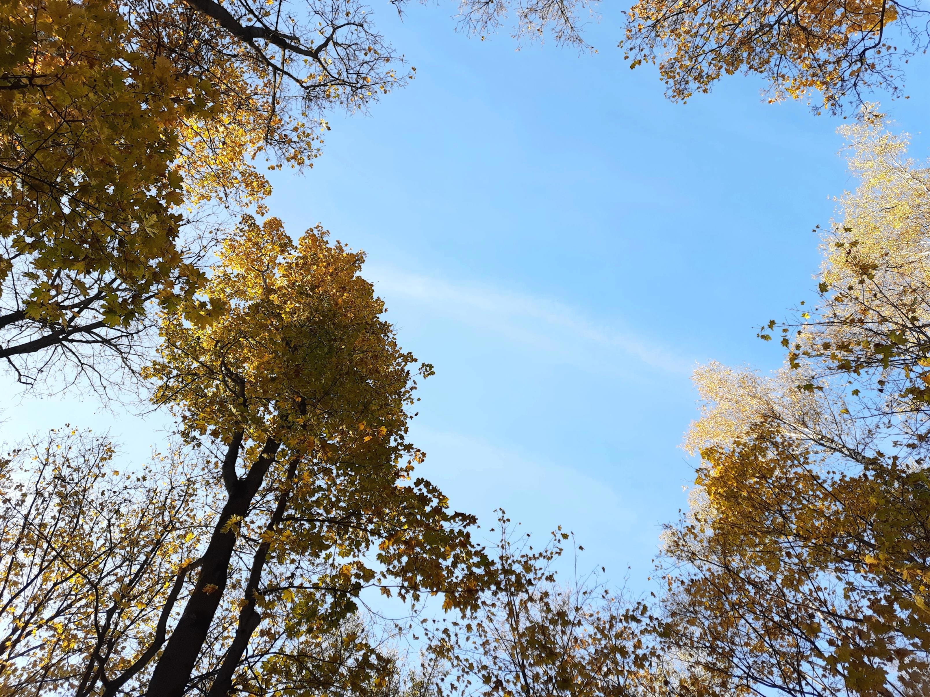 Фото 1: Осенние деревья на фоне неба. Вечер. Щукинский парк, город Москва, октябрь 2024 года.