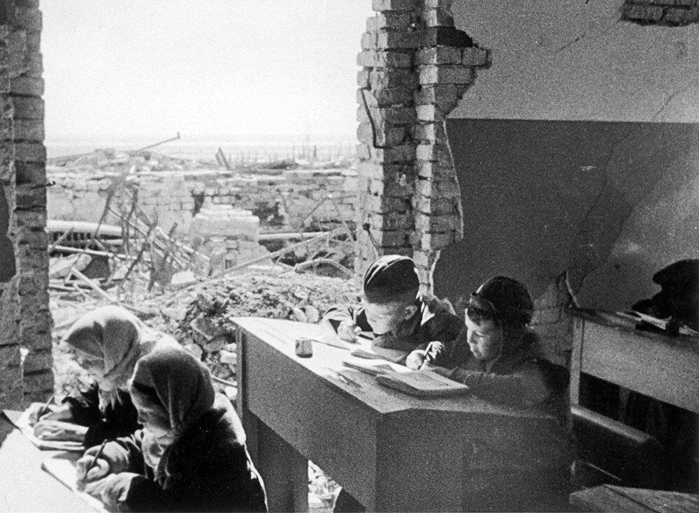 Криво наштукатуренные тёти с интересом посмотрели на "озабоченного интеллигента". Директор школы поддержал меня и сказал, что сейчас не время делить школы по половому признаку. Во многих городах и общие-то школы требуют значительного ремонта. Пустил по рядам фотографию из своего родного Сталинграда. Это когда он пришёл после демобилизации на Первое сентября в родную школу в 1945-м году...