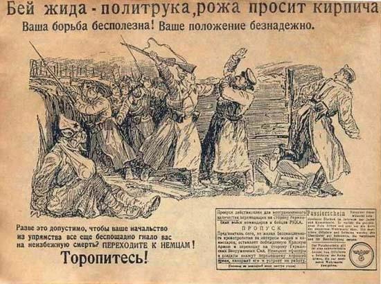 Но прошло семь лет, и в сентябре 1941 года ведомство доктора Геббельса, остроумно названное Министерством Пропаганды и Просвещения, выдало листовку под реестровым номером 150 RA/1 , с чуть чуть переделанной картинкой из Советского манускрипта 1935 года, и отпечатана тиражом, аж в 160 млн экземпляров, т.е. на каждого жителя СССР, включая младенцев по одной штуке. А самолеты люфтваффе их активно сбрасывали.