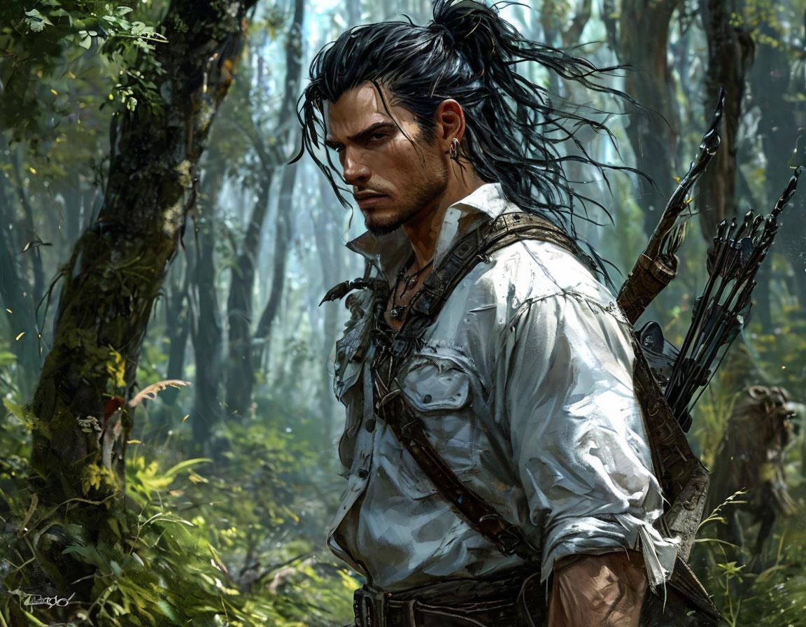 "В несколько больших прыжков рядом с кабаном возник мужчина. Он тяжело дышал, видно было, что он бежал какое-то время, преследую добычу. Он был высок, это было видно даже на расстоянии. Под свободной льняной рубахой угадывалась широкая грудь и сильные руки, но не такие раздутые, как у ходивших в зал качков из ее мира, а скорее выточенные тяжелой каждодневной работой. На запястьях их охватывали широкие кожаные наручи, подчеркивающие его красивые кисти с длинными тонкими пальцами.