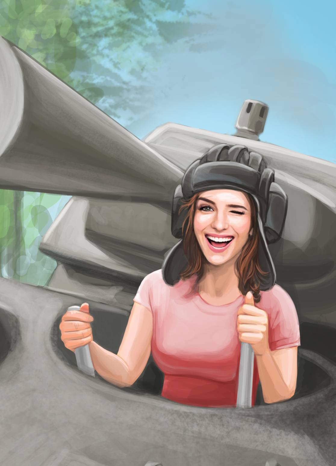 Теперь встал вопрос с композицией. Я решил посмотреть, как это выглядит в натуре - взял супругу, фотоаппарат, и отправился к ближайшему танку. (В романе я писал, что в каждом приличном городе есть памятник танку Т-34. В нашем тоже есть). Выяснилось, что человек на фоне Т-34 смотрится мелковато. Конечно же, хорошо бы ещё посмотреть, как будет выглядеть героиня (т.е. изображающая её супруга) на месте мехвода. Стал прикидывать, где есть танк в бОльшей доступности. Вспомнил - на загородной базе МВТУ! Там они испытывали что-то такое, к чему приближаться было опасно, а посмотреть хотелось. Поэтому выписали себе танк - как раз Т-34-76. Помнится, в своё время я всё ходил вокруг него, но так и не решился залезть. Тогда он уже был не на ходу - руководство базы приказало испортить движок, а то студенты с военной кафедры повадились на нём за водкой ездить. Стал выяснять его судьбу - оказалось, он уже давно в музее танка Т-34 на Дмитровском шоссе, стоит на постаменте. Можно, конечно, было бы съездить на покатушки куда-нибудь в Кубинку, но там эта радость стоит под 50 тысяч. В очередной раз задушила жаба.