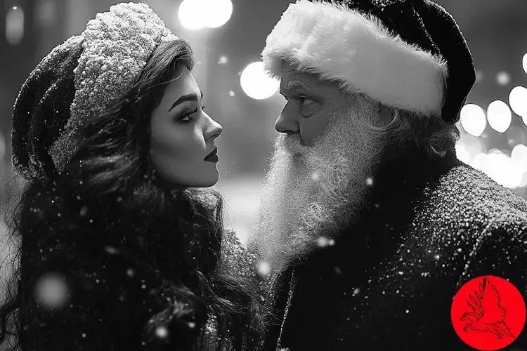 Видит молодец, на пеньке возле ёлки дева сидит, да на него лукаво поглядывает. Очи тёмной синевой сверкают. Коса длинная расплелась и прямо по снегу стелется. Душегрейка на девице тонкая, жемчугами расшитая, а на лбу венец из каменьев самоцветных.