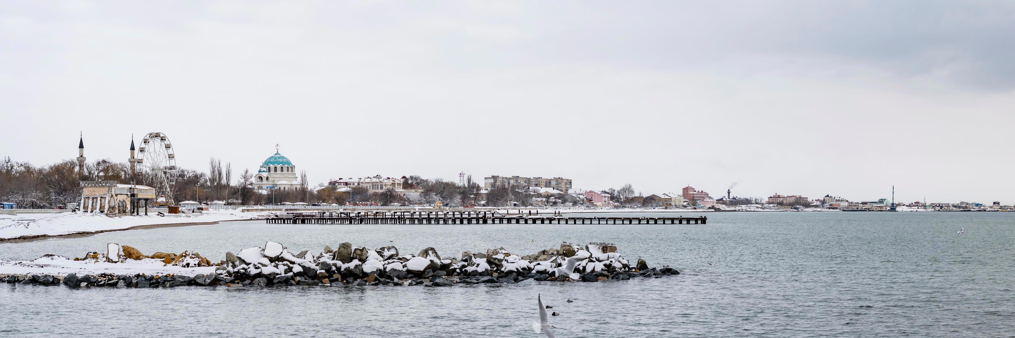 И зимняя, заснеженная Евпатория. Это прошлый год. Несмотря на снег видно, что набережную ещё не сдали в эксплуатацию.