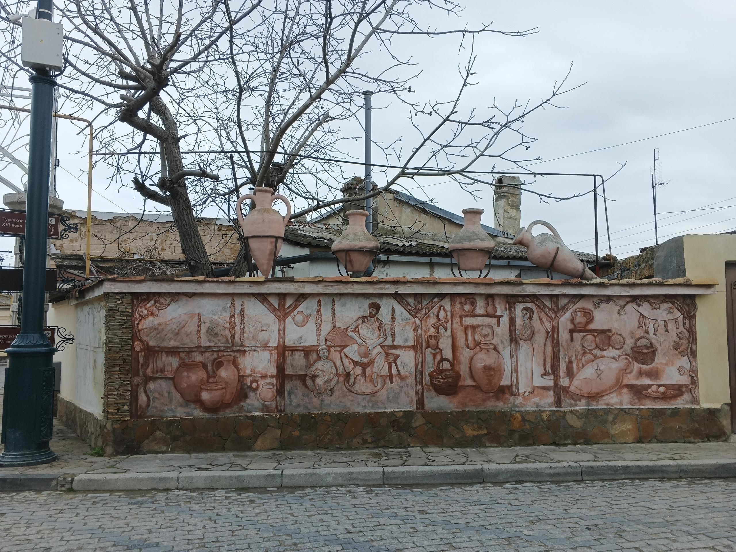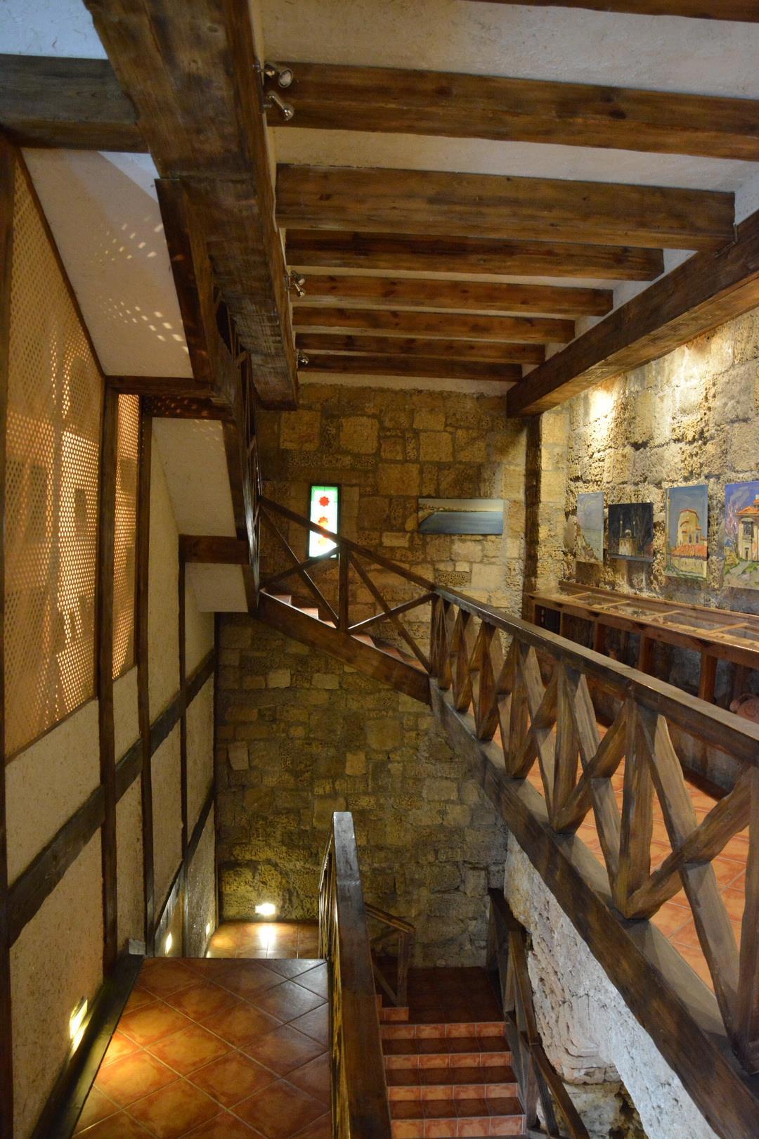 А это галерея в кафе "Гезлёвские ворота". За решётчатой стеночкой кафе, а вдоль стены галерея с картинами евпаторийских художников и лестница на третий этаж в музей.