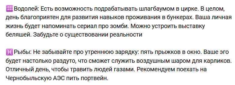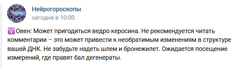 Из неосновного: есть у меня 2 любимых паблика в вк — «Отказала модная железа» и «Нейрогороскопы» (потому что это единственные гороскопы, которым я верю!))))) Так что принесла Вам откушать пару скриншотиков из последнего, чтобы Вы тоже прониклись крайней степенью доверия долей хорошего настроения с помощью этих прогнозов: