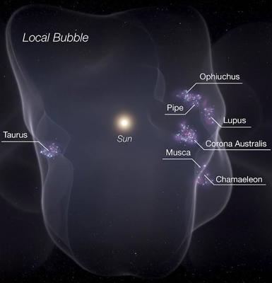 Ну и само пространство Чарийских циклов — это Местный Пузырь. Выглядящее как чулок место между областями звездообразования в Тельце и Волке,