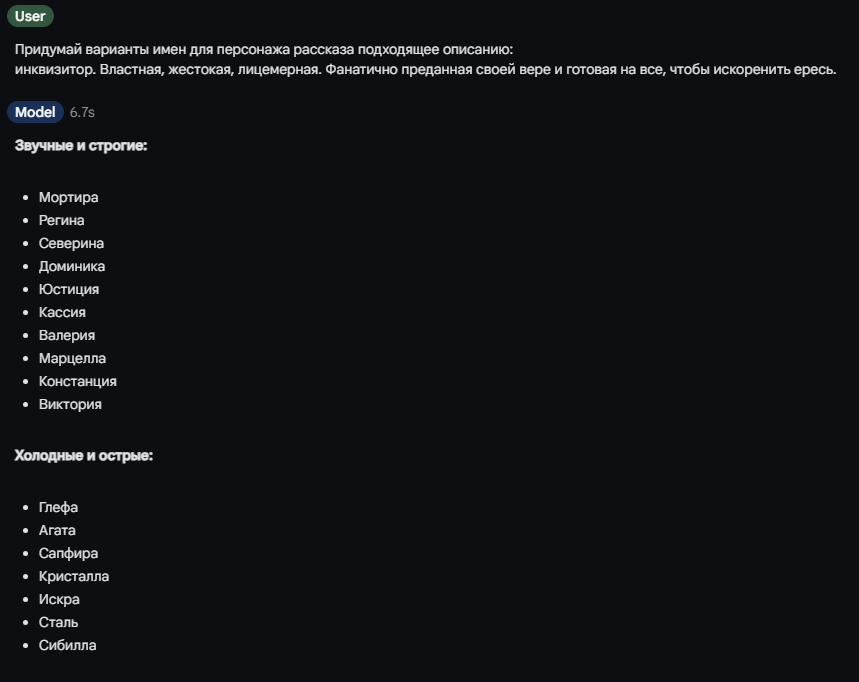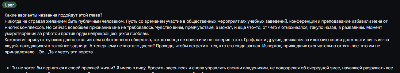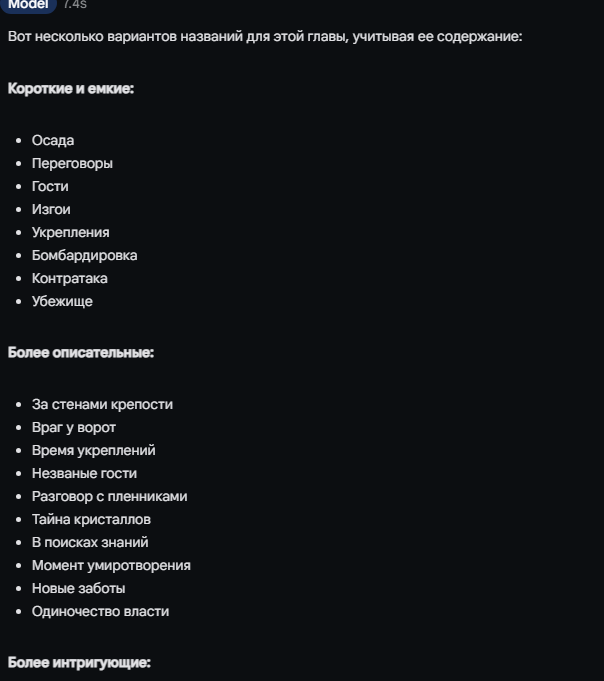 - Подбор названий: Генерация вариантов названий для произведений, глав, локаций и т.п.