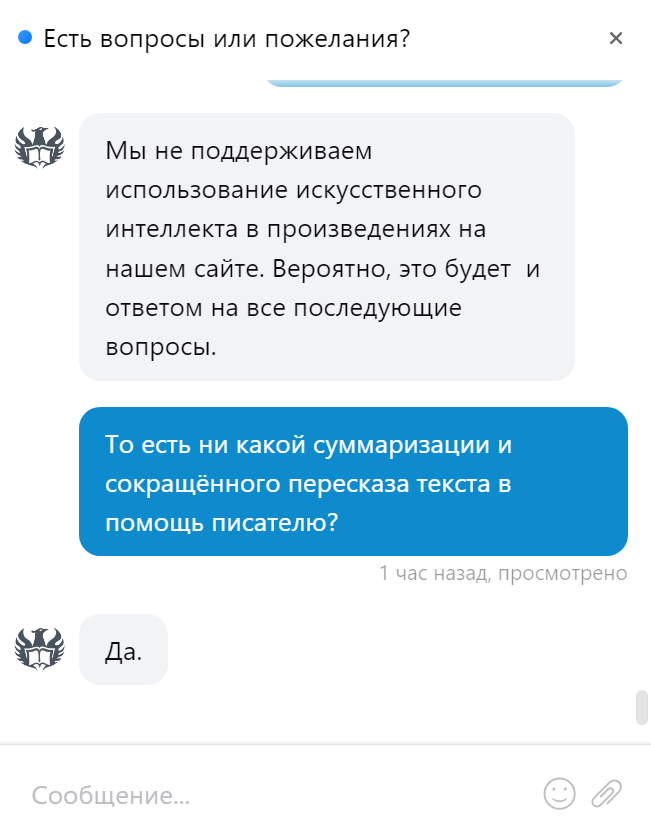 Мы не поддерживаем использование искусственного интеллекта в произведениях на нашем сайте. Вероятно, это будет и ответом на все последующие вопросы.