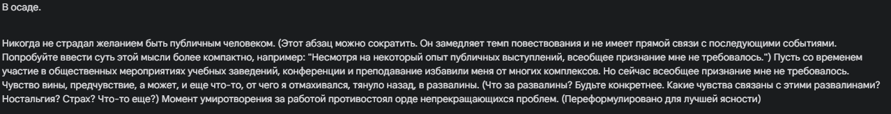- Советы по улучшению: Предложения по улучшению абзацев, диалогов и сюжета на основе известных шаблонов и общих принципов.