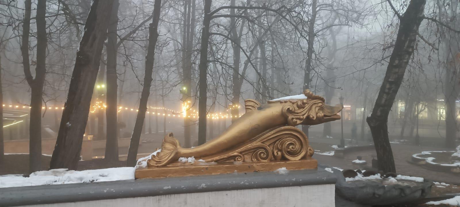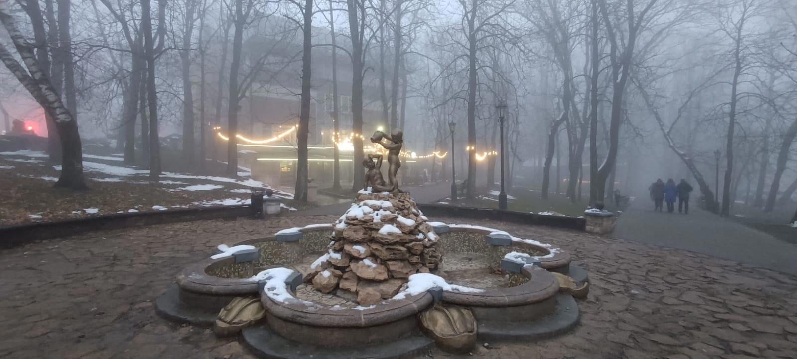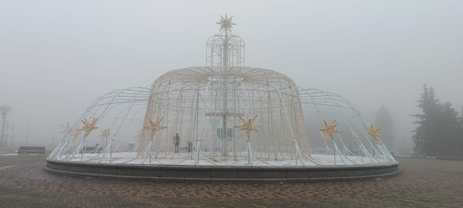 Большой фонтан на площади, где Крест. Его при нас украшали светодиодами и сразу включили. И он красиво в тумане горел желтыми огоньками. В тумане это было весьма романтично.