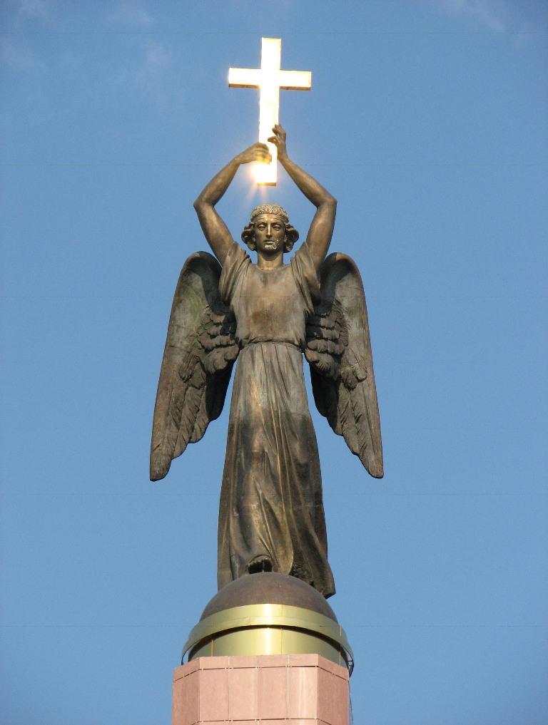 Мы переходили дорогу по "зебре" и перед нами выросла эта величественная стелла с Ангелом-Хранителем на самом верху. Стелла, как видите, была окутана густым туманом, но ангел все равно был различим... При хорошей ясной погоде, это выглядит вот так.