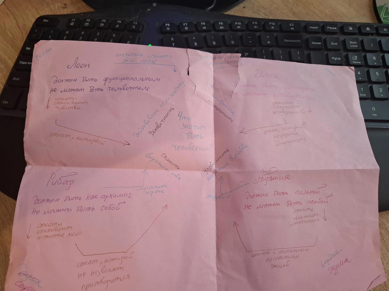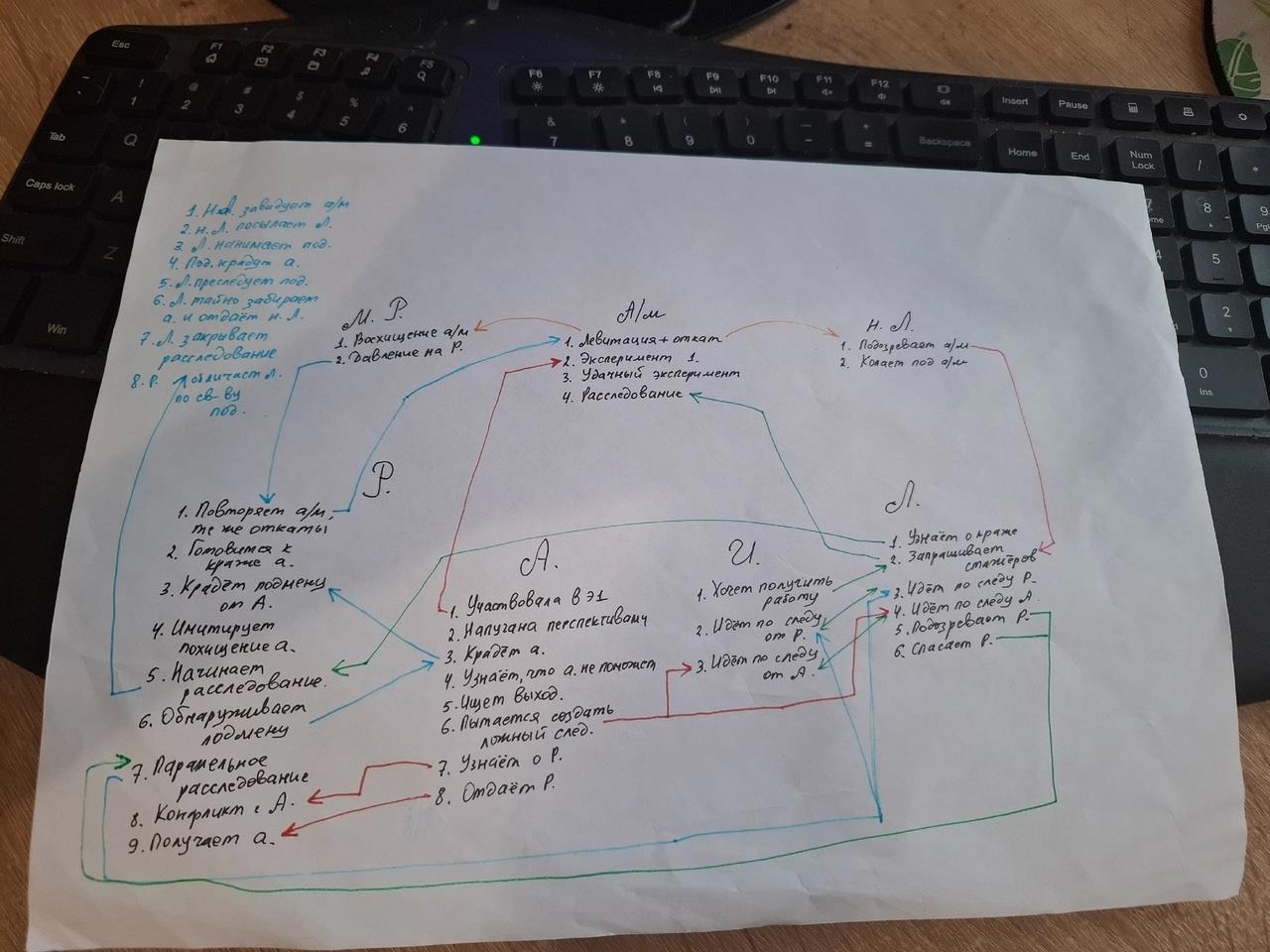 Сюжет (вы будете ржать, но мне рили все предельно понятно, и я создала этот листок именно потому, что мне так все проще и нагляднее было видно). Упс, правда, финальная версия немного от него отличается!
