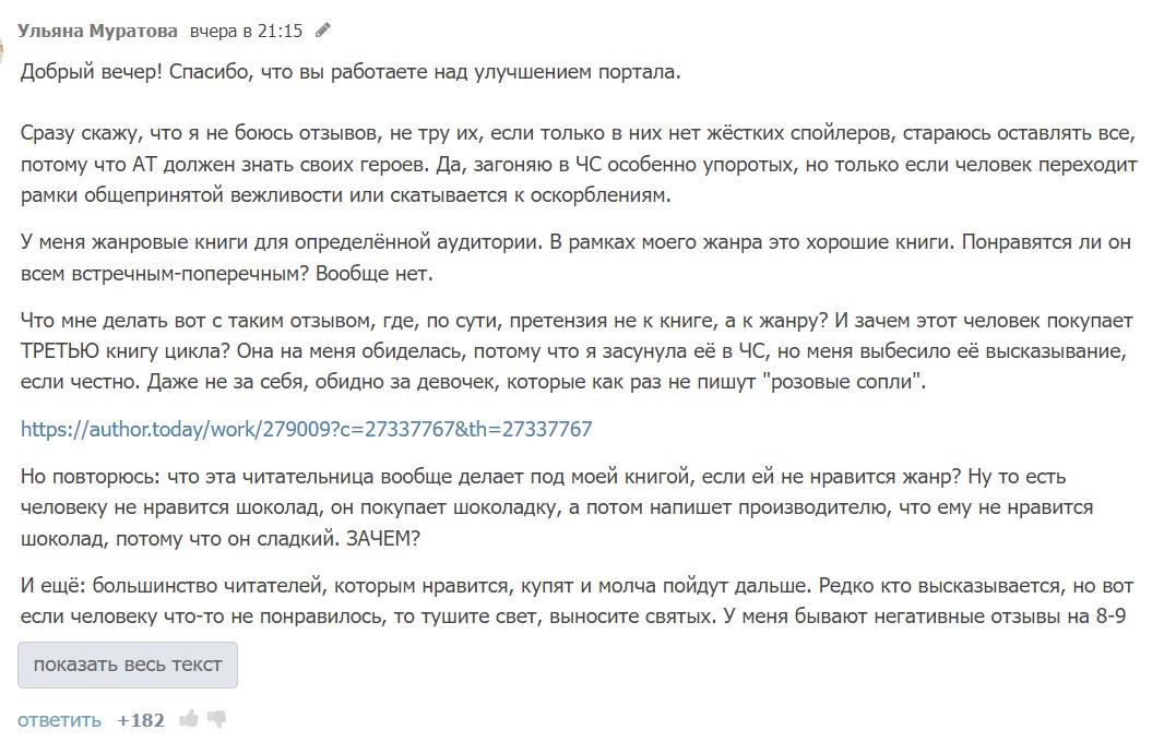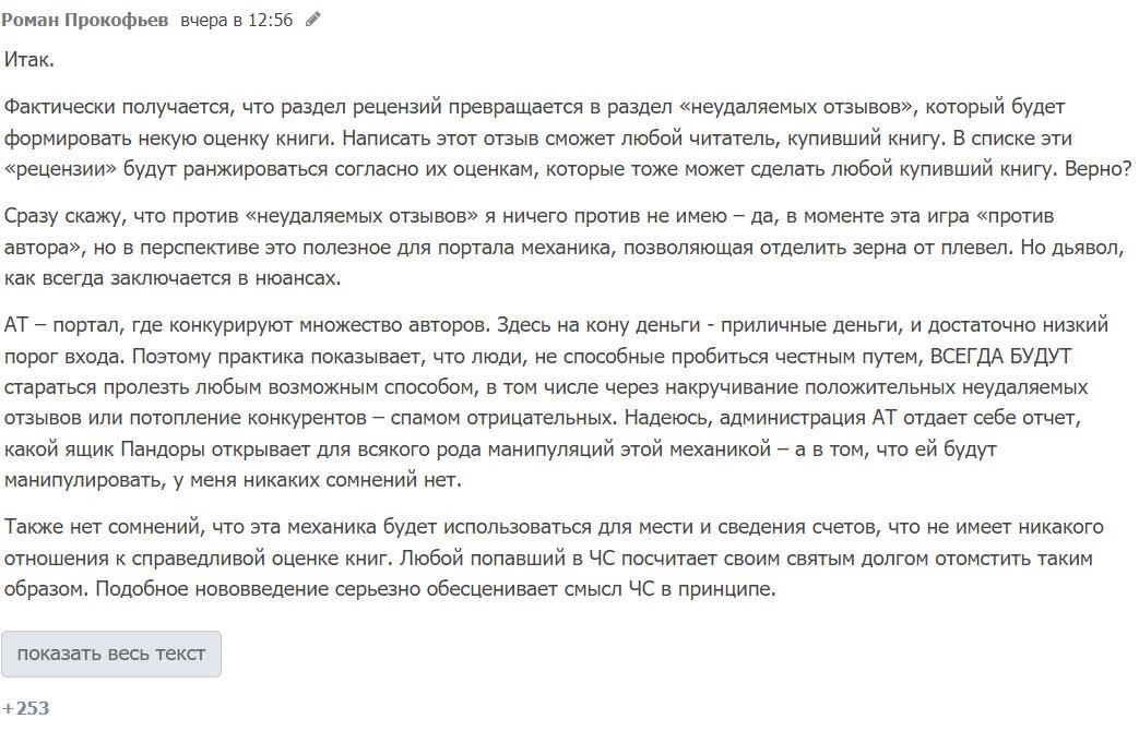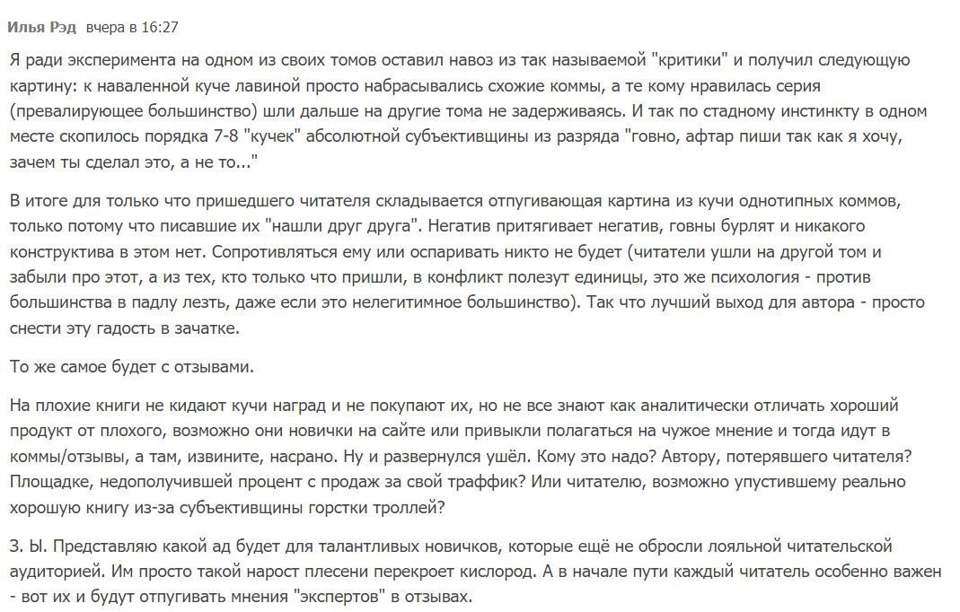 З. Ы. Представляю какой ад будет для талантливых новичков, которые ещë не обросли лояльной читательской аудиторией. Им просто такой нарост плесени перекроет кислород. А в начале пути каждый читатель особенно важен - вот их и будут отпугивать мнения "экспертов" в отзывах.