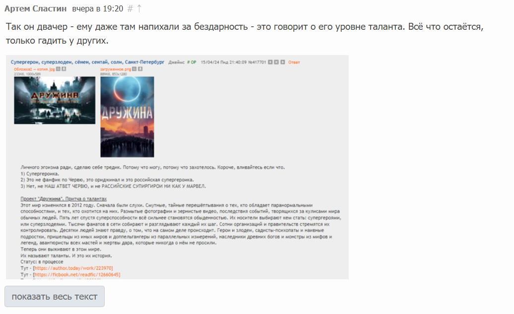 Сотни непризнанных засранных гениев. Статистику можно, по неадекватам авторам которые засирают других? Конкретную статистику, когда автор-хейтер поднялся на хейте другого автора? Есть такая? Я вот читатель, если я как читатель прихожу на страницу книги и вижу что Вася там пишет: