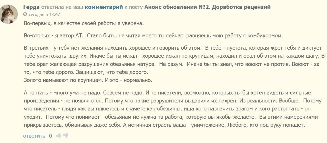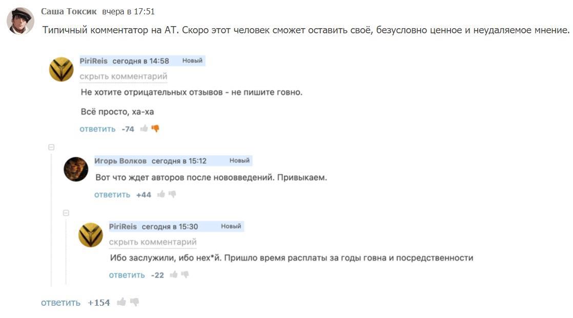В итоге для только что пришедшего читателя складывается отпугивающая картина из кучи однотипных коммов, только потому что писавшие их "нашли друг друга". Негатив притягивает негатив, говны бурлят и никакого конструктива в этом нет.