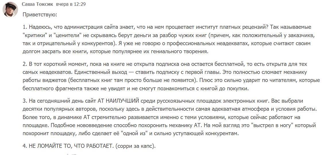 В текущей парадигме АТ, читатель должен всем и сразу. Подписку купи, книгу купи. Читателю качество почему-то никто не спешит обещать. Рыночек внезапно порешал, и начал поднимать вопрос о качестве. Авторы взвыли и начали плакать про доходы, а ВОПРОС КАЧЕСТВА ГДЕ?