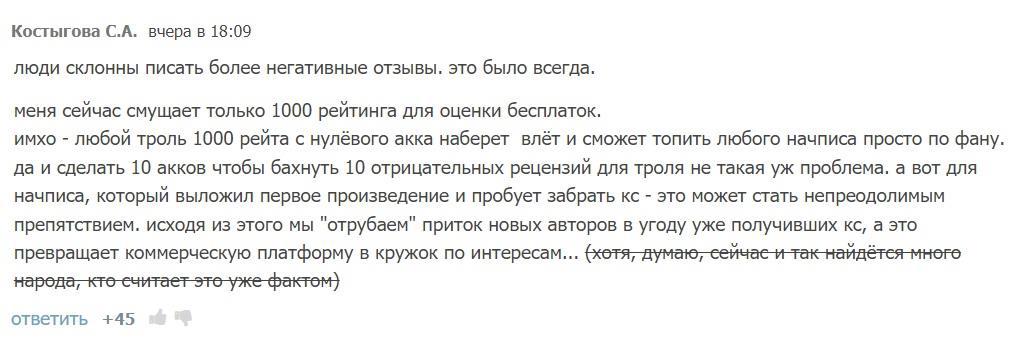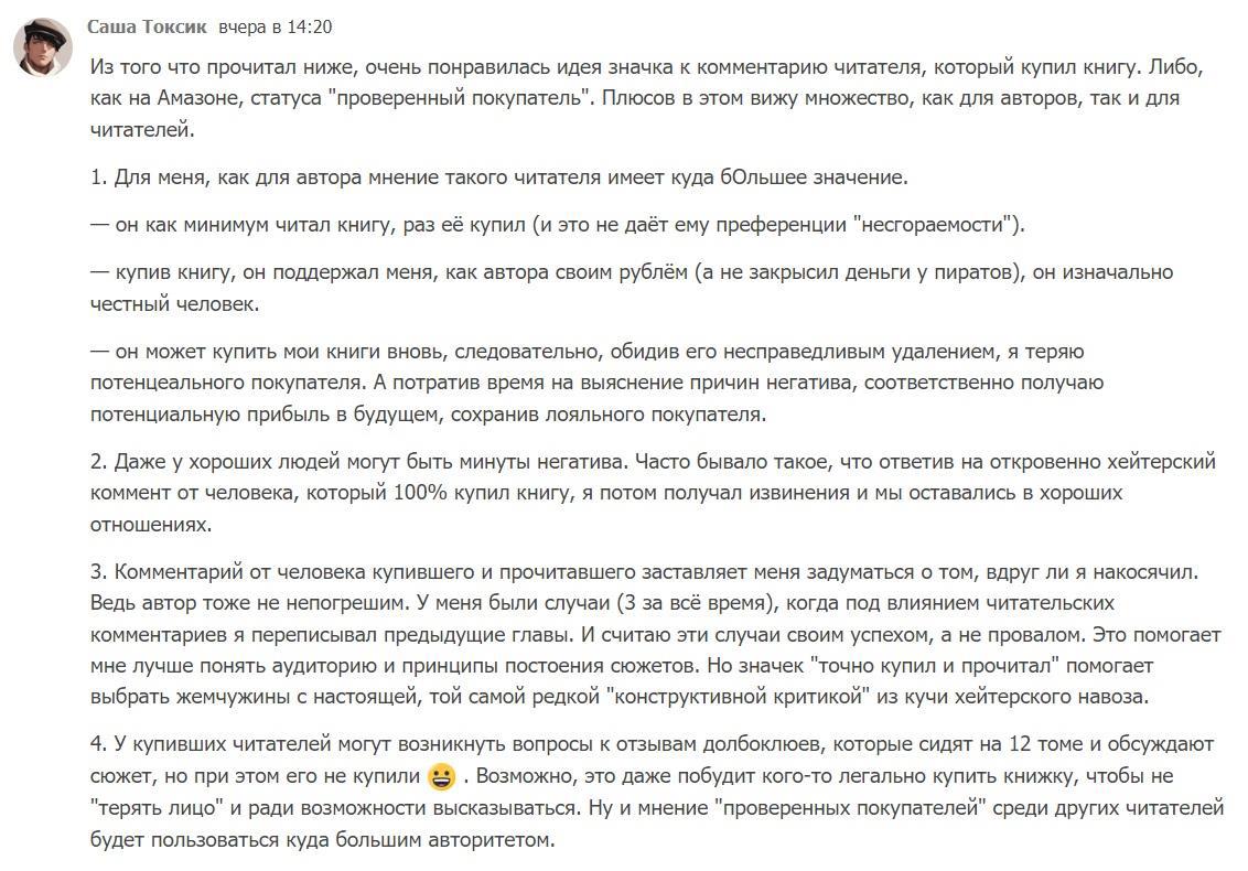 3. Комментарий от человека купившего и прочитавшего заставляет меня задуматься о том, вдруг ли я накосячил. Ведь автор тоже не непогрешим. У меня были случаи (3 за всё время), когда под влиянием читательских комментариев я переписывал предыдущие главы.