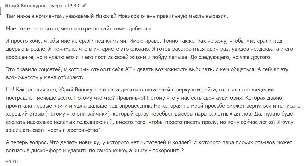 Но! Как раз лично я, Юрий Винокуров и пара десятков писателей с верхушки рейта, от этих нововведений пострадают меньше всего.
