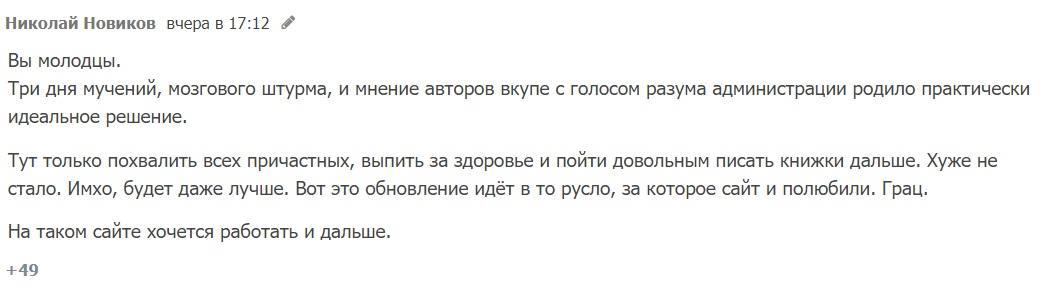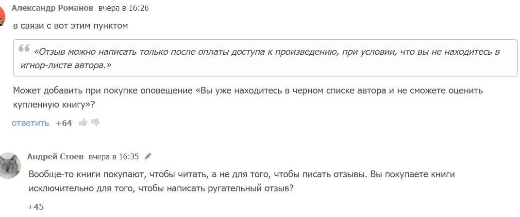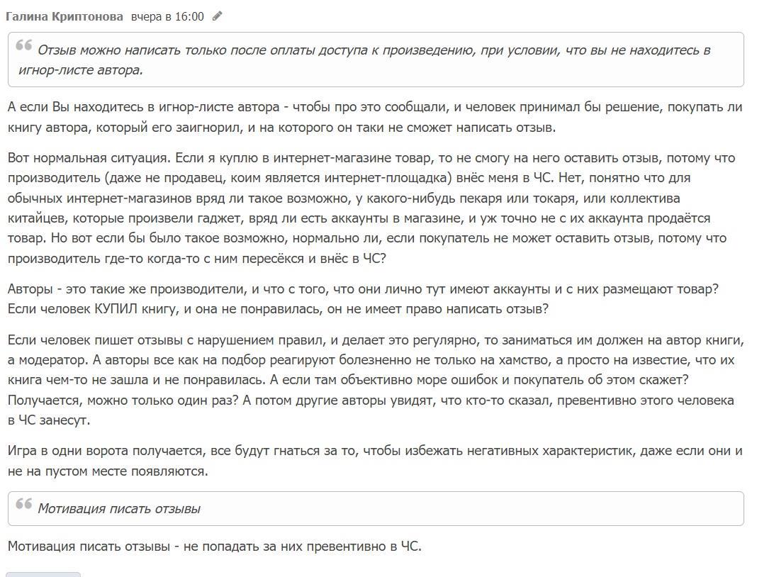 Всё, вы не нужны как читатель, вы не нужны как человек имеющий свое мнение, вы должны заплатить за книгу и пойти нахуй. Администрация вам это прямым текстом не скажет, а вот некоторые авторы уже проявили своё нутро в комментах, и прямо так и говорят. А если вы не хотите платить за то чтобы на ваше мнение насрали, вы идете нахуй сразу, даже без приглашения и экивоков