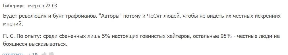 Даже дураку будет ясно, что честных, благородных авторов труженников, обижают лишь неадекватные хейтеры, которые спят и видят возможность насрать честным, благородным авторам, геморой нажившим в поте лица своего при пробежке от клавы до кухни, прямо в пустую кашу без масла и соли, на которую им едва-едва хватило доходов с продаж