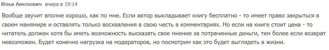 Вообще звучит вполне хорошо, как по мне. Если автор выкладывает книгу бесплатно - то имеет право закрыться в своем манямире и оставлять только восхваления в свою честь в комментариях. Но если на книге стоит цена - то читатель должен хотя бы иметь возможность высказать свое мнение за потраченные деньги, тем более если возврат невозможен. Будет конечно нагрузка на модераторов, но посмотрим как это будет выглядеть в жизни.