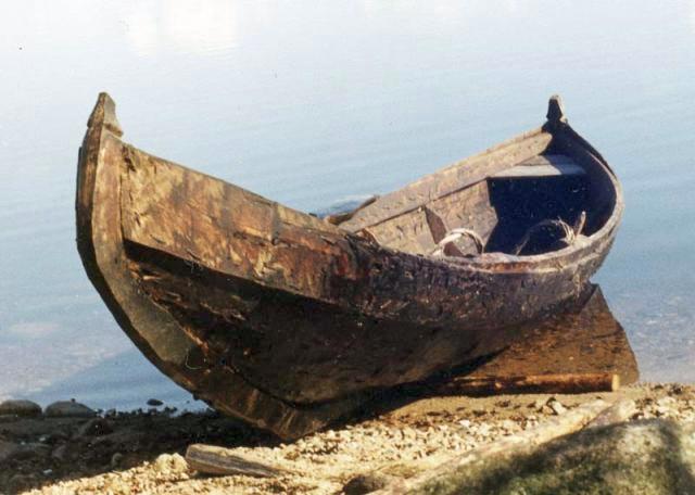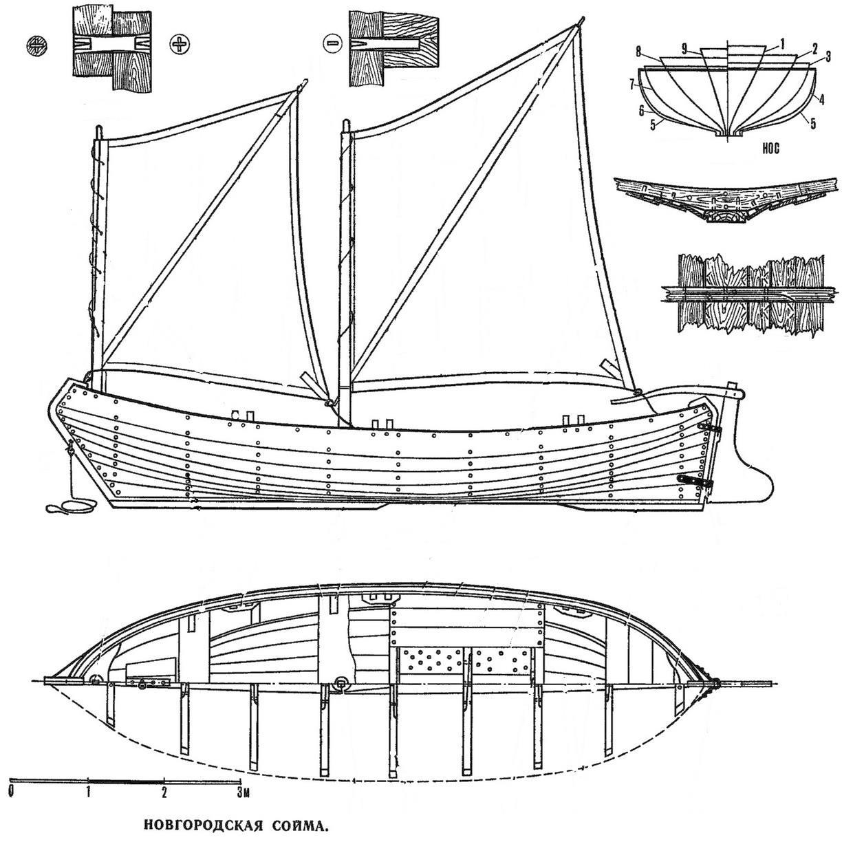 В общем, сойма – это морское парусно-гребное судно, несущее одну или две мачты с одним или двумя парусами. В поперечном сечении судно килеватое, то есть не имеющее плоского участка совсем. Наружная обшивка сформирована из широких досок внакрой, сшитых между собой вицей. К набору доски были закреплены деревянными нагелями. Форштевень соймы имеет в надводной части очень характерный «лебединый» изгиб, из-за которого их и называют «курносыми». Наиболее архаичные варианты конструкции такой же изгиб имели и в корме, но потом ахтерштевень стали делать прямым. Говорят, что это делалось для того, чтобы уберечь борта во время швартовок одного судна к другому в условиях волнения. Сомнительно, ну ладно. На соймах традиционно ставился руль, закреплённый на ахтерштевне. Этим они были намного совершеннее их западных соседей, а нежёсткая конструкция корпуса позволяла без труда ходить по короткой крутой Ладожской волне, что делало соймы просто незаменимыми в тяжёлых условия местного плавания. Ещё один интересный элемент конструкции – это выступающие элементы киля на днище. С одной стороны они выполняют функции «нормального» киля парусника для улучшения характеристик лавирования под парусом, а с другой – предохраняют корпус судна при швартовке носом к необорудованному берегу или посадке на мель. Что-то я говорю, да говорю... вот картинка. Это и есть «курносая» сойма:
