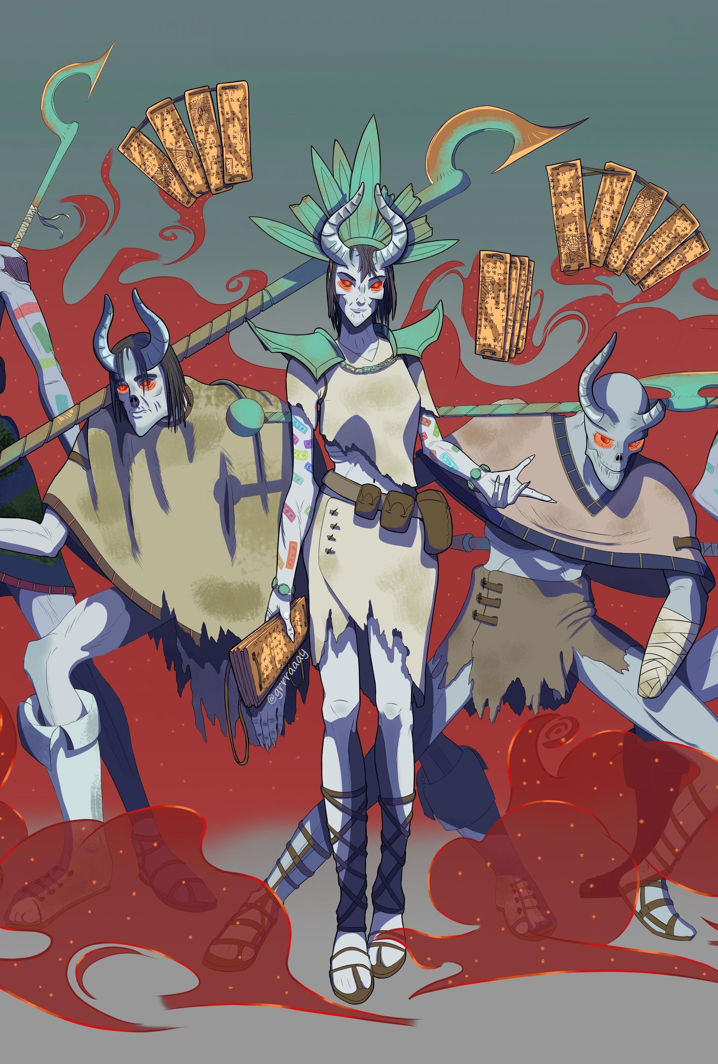 Из его глаз вырвались лучи света. В воздухе между собравшимися сформировалась человекоподобная фигура. Сперва нечёткая, но постепенно деталей стало больше и Мастер огня увидел странную женщину. Она оказалась высокой и худой, с острым подбородком и такими же острыми скулами, длинными тонкими пальцами и парой сплюснутых в сечении рогов. На тонких запястьях блестели два одинаковых браслета состоящих из шестигранных металлических звеньев, выше украшений руки устилали разноцветные прямоугольные татуировки с неизвестными Крису символами, лицо женщины покрывала ритуальная росписью. Она носила остроконечные металлические наплечники, за рогами прятался ободок, державший нечто вроде опахала, однако все эти украшения резко контрастировали с обносками служившими ей одеждой.