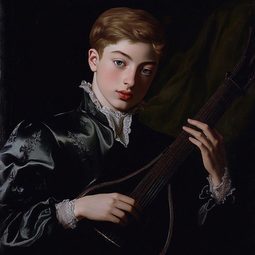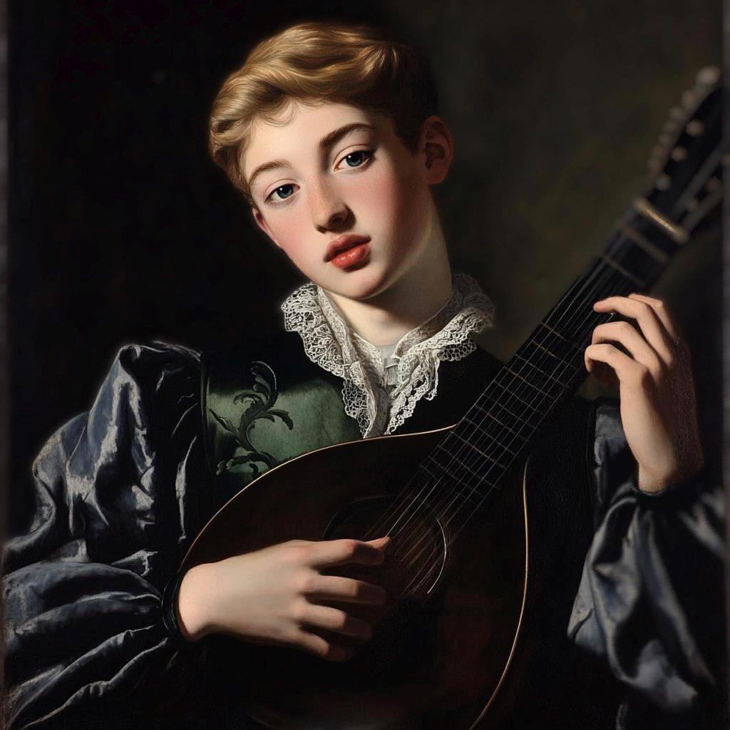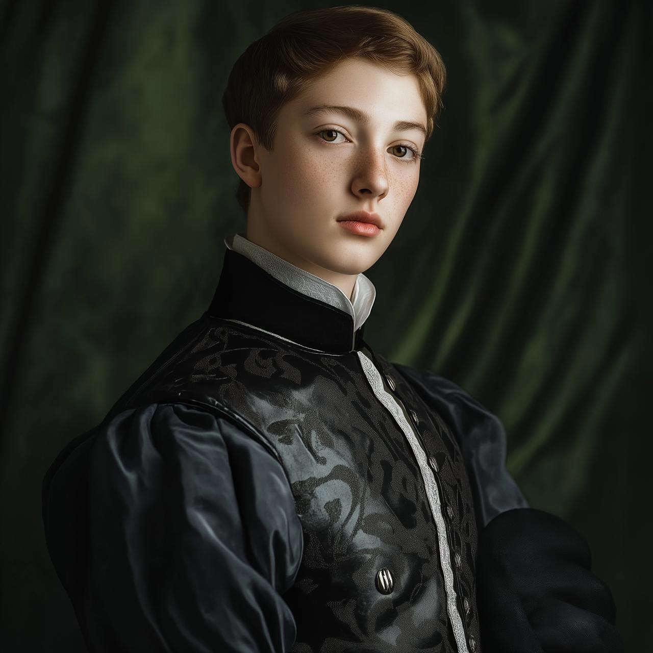 "Юноша и вправду напоминал переодетую красотку, так что любого мог ввести в заблуждение. Тонкие и правильные черты лица, пребывающие в идеальной гармонии, ярко-синие глаза в обрамлении пушистых ресниц, одновременно изящный и капризный изгиб губ, надменно-томный взгляд… Он знал этот взгляд человека, уверенного в своем совершенстве, взгляд, сводящий с ума девиц и даже дам. И именно этот взгляд подсказал художнику, что юноша отдает себе отчет в собственной неотразимости ... Паж неожиданно шагнул вперед своего сеньора.
