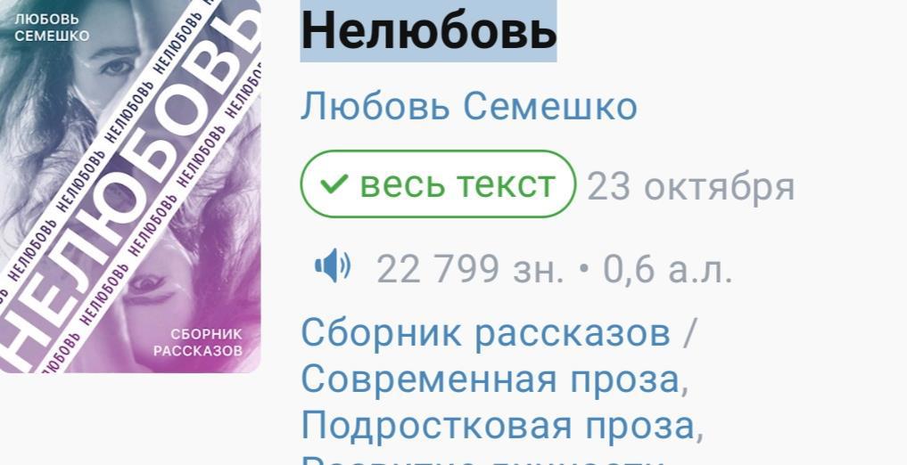 Автор: Любовь СемешкоКак же хорошо, что в сборнике рассказов "Нелюбовь" мои дорогие читатели и друзья видят любовь. Вот и сегодня на этот сборник написала замечательную рецензию уважаемая Елена Филатова. https://author.today/u/yaqazzaq2012